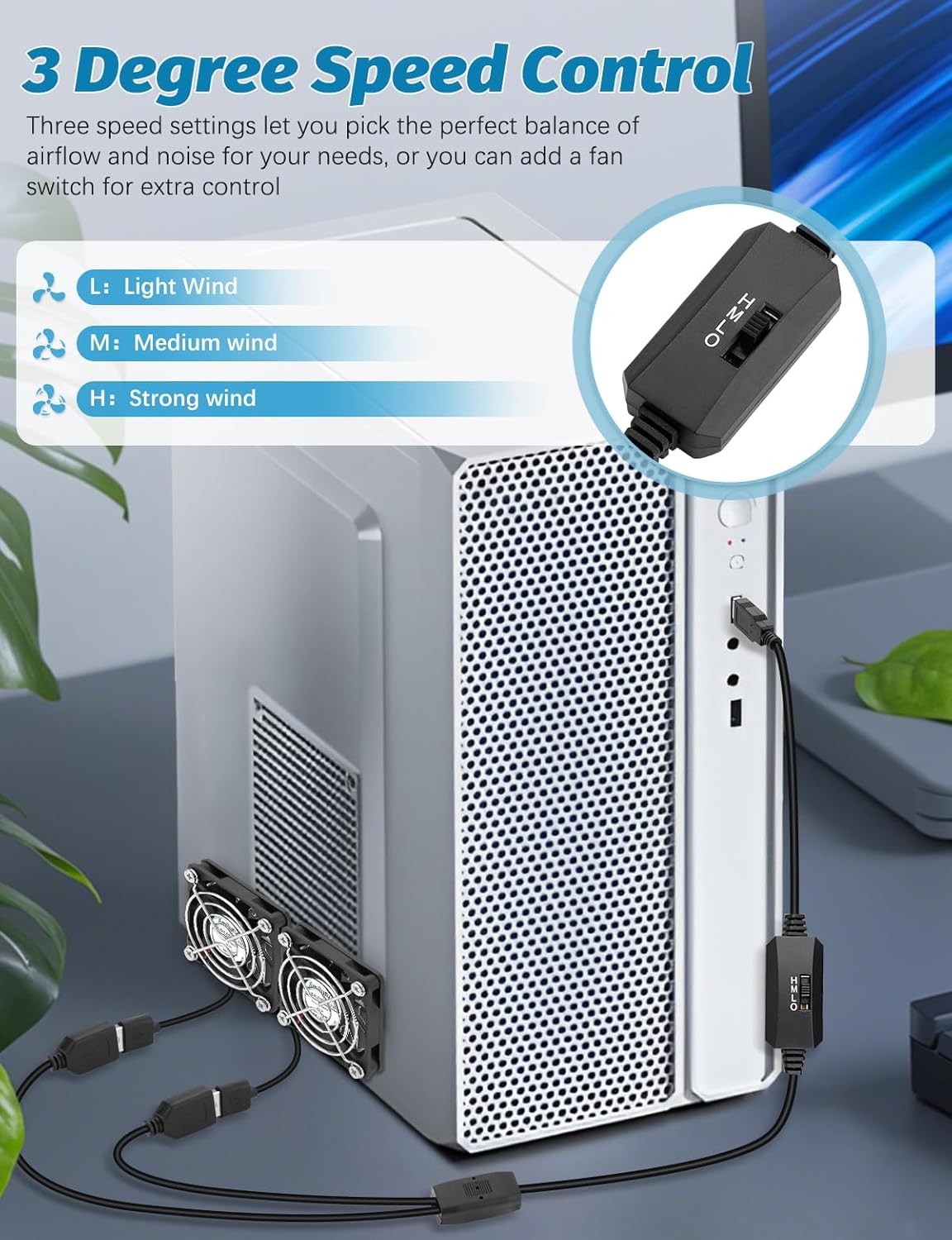 - USB Powered Fan: Included in this fan kit, you'll find two USB fans, a dual-power cord to manage both fans at once, and a safeguarding iron mesh to ensure your hands stay protected