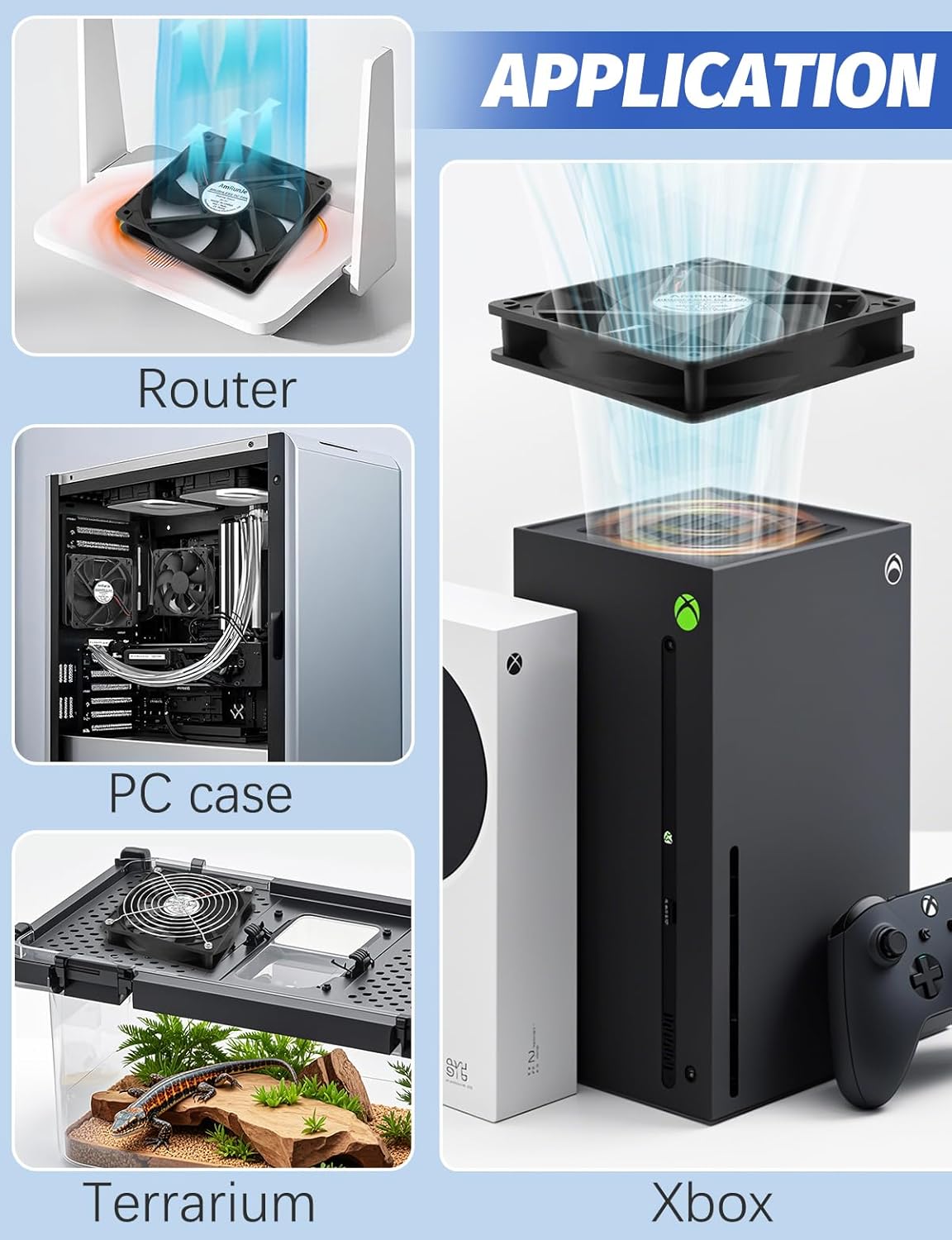 - APPLICATION: USB computer fans cool off gaming systems, routers, amplifiers, and receivers. 120mm case fan keep entertainment centers' stereos and cables cool and help with air flow in various spaces