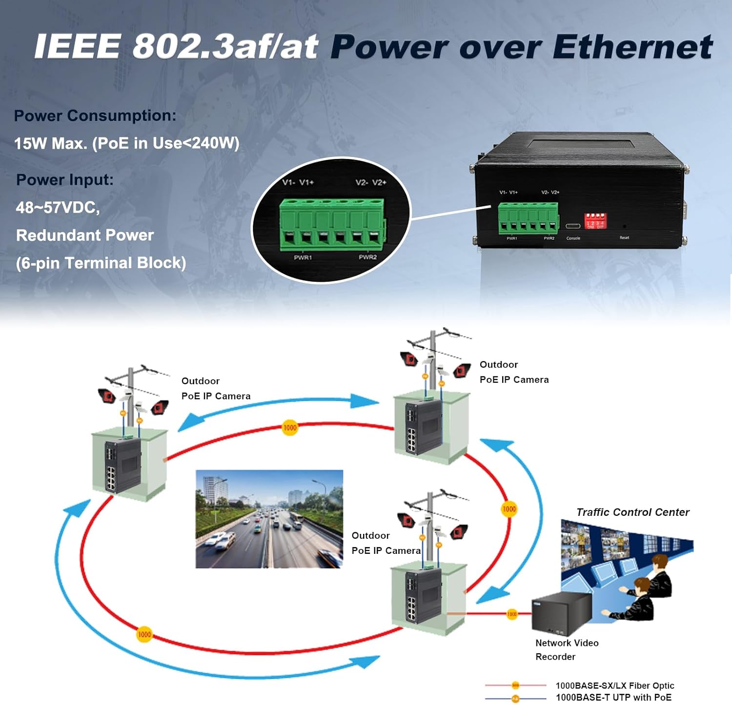 - 【IEEE802.3af/at PoE standard】The industrial PoE switch provides 8-port IEEE802.3af/at PoE+(30W) function for kinds of Powered Devices to receive power as well as data over the RJ-45 cable.