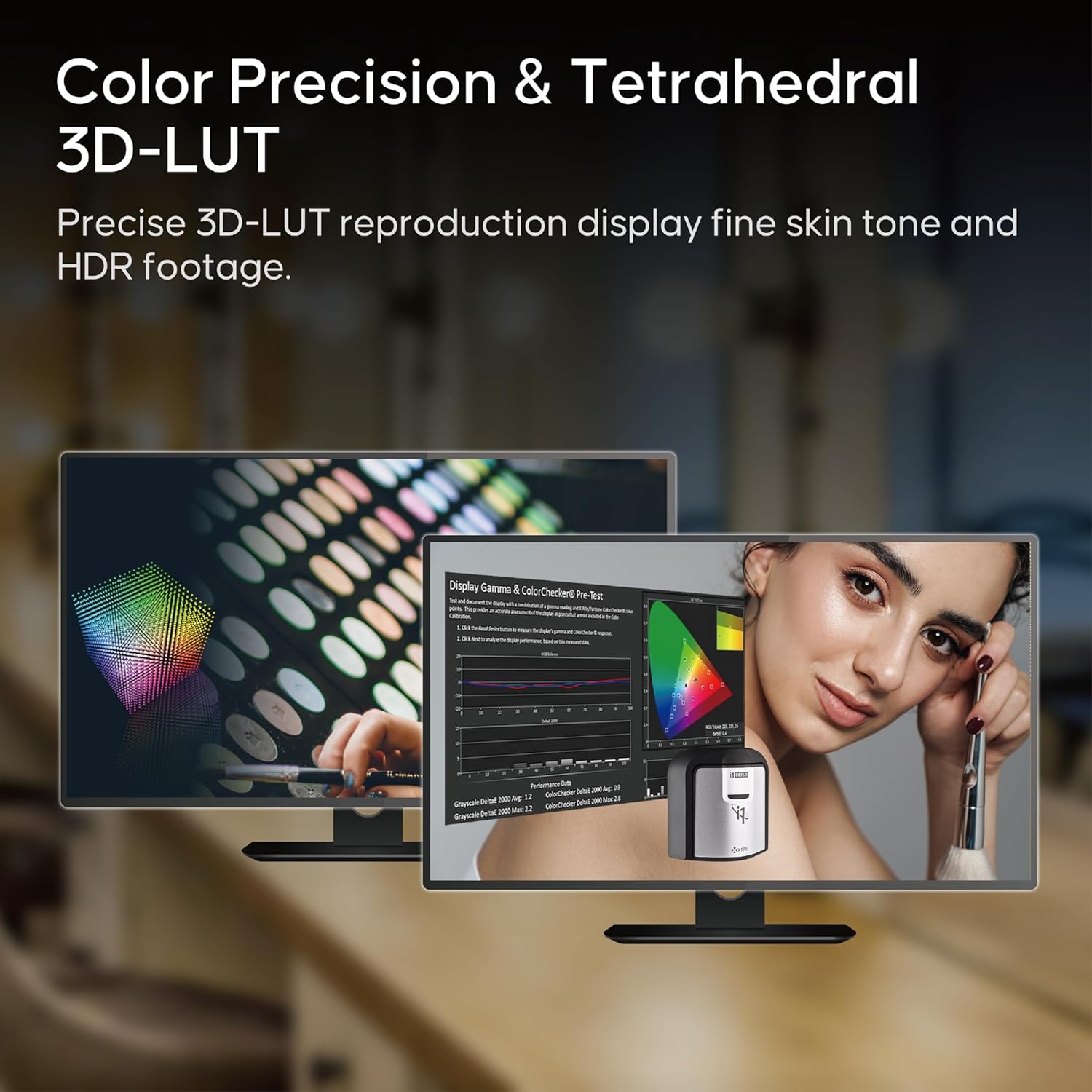 - 【Analysis Mode & Up to 10 3D-Luts】 Monitor using the waveform, histogram & vectorscope tools simultaneously, customizable false color and 8 preview MySets, greatly improve your work efficiency. The precise 3D-LUT reproduction can display fine skin tone and HDR footage, 22-bit internal processing provides 18 stops of dynamic range. (you can upload 3D LUTs via SD card)
