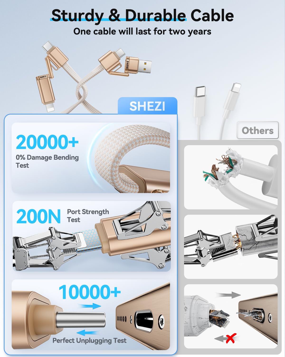 - Applestyle 4-in-1 Charging Cable - The Way of Simplicity: SHEZI is the first to launch the new Applestyle Series of 4-in-1 charger cable for devices with USB A to Lightning, USB A to Type C, Type C to Lightning, and Type C to Type C ports. One cable for all your needs. Designed with compactness and practicality in mind, it combines the minimalist look of Applestyle with 4-in-1 ports, bringing you a distinctive, minimalist and luxurious shopping experience