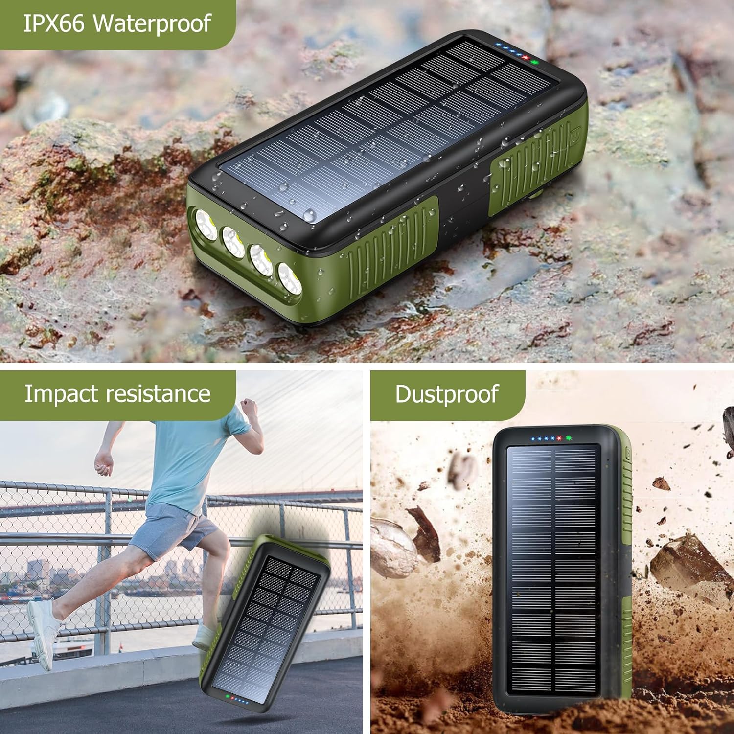 - 【Fast Charging Portable Charger】: The solar power bank uses strong professional ABS material, chemical resistant, heat resistant, excellent surface hardness, high elasticity and toughness. waterproof, dropproof and dustproof, so you no longer have to worry about water/drop damage, it can work in extreme environments. With more than 1600 charge life cycles, it is very reliable and durable.