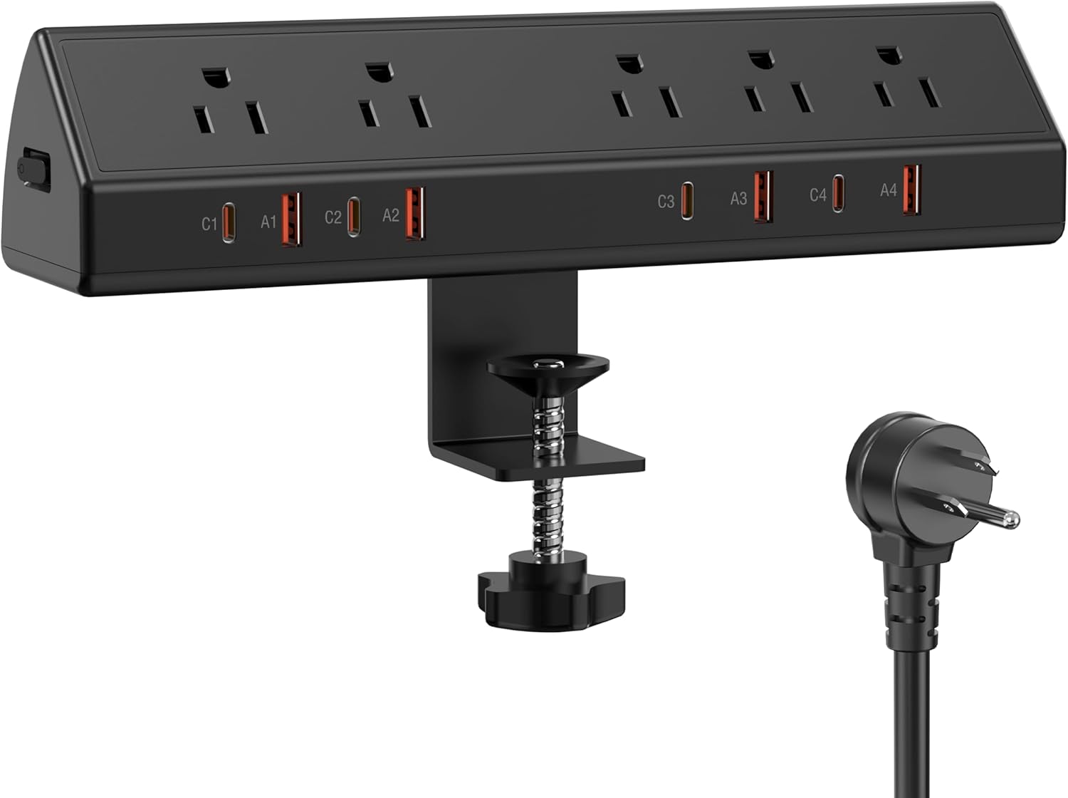 - Clamp-On Surge Protector for Tidy Workspaces: Engineered for stability,say goodbye to tangled cables and unstable setups. 1200-joule surge protection, fire-resistant ABS casing, and overload/overcharge protection.
