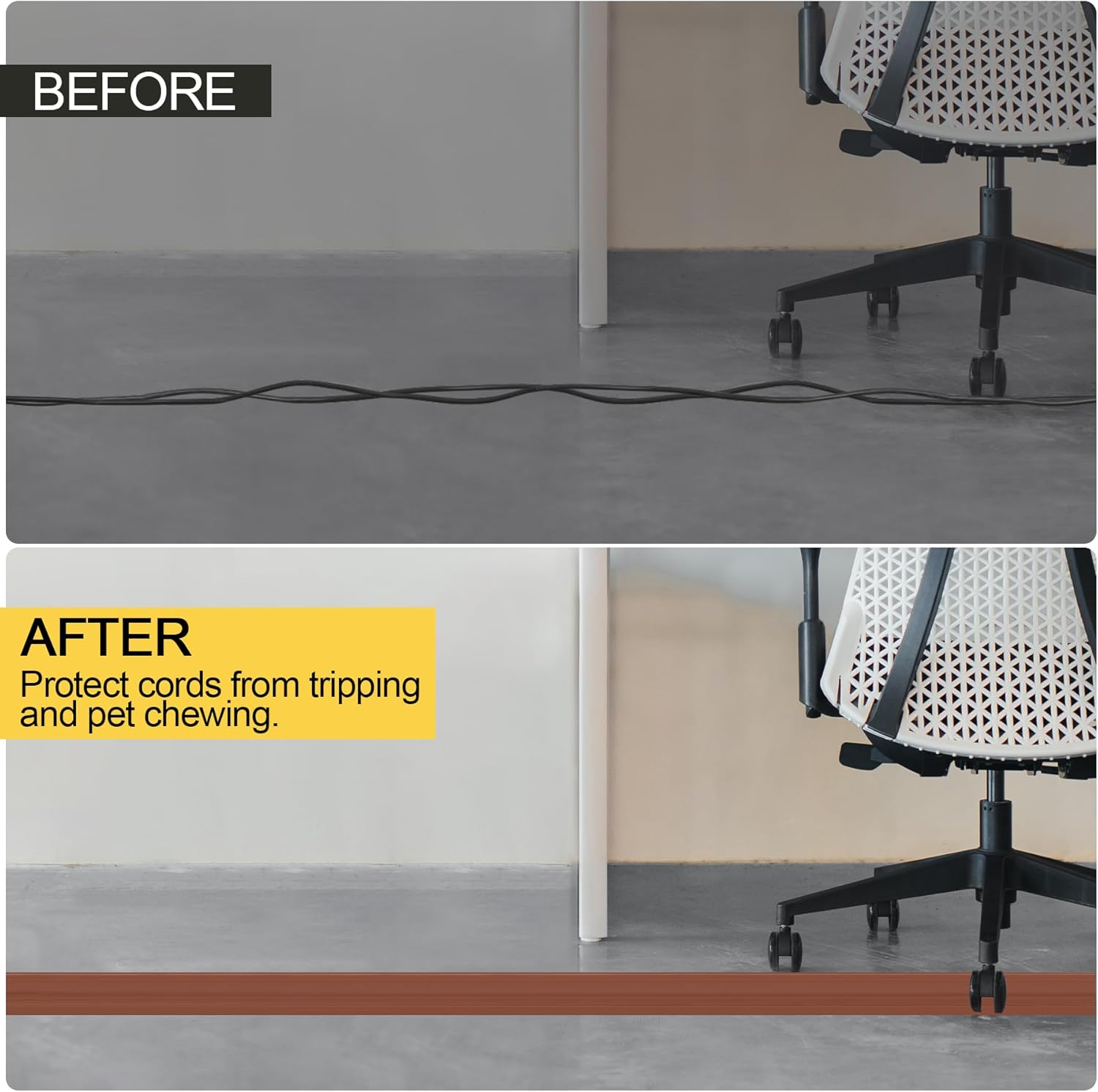 - 【Protection of Cords】Floor cord cover for wires can efficiently hide and protect cords. Prevent accidental tripping caused by cables dragging. Prevent cables from being crushed and stepped on, reduce damage and extend cables usage time. Tips: Due to tight packaging, if you feel that cord cover is not flat enough, you can first press it with heavy object before use