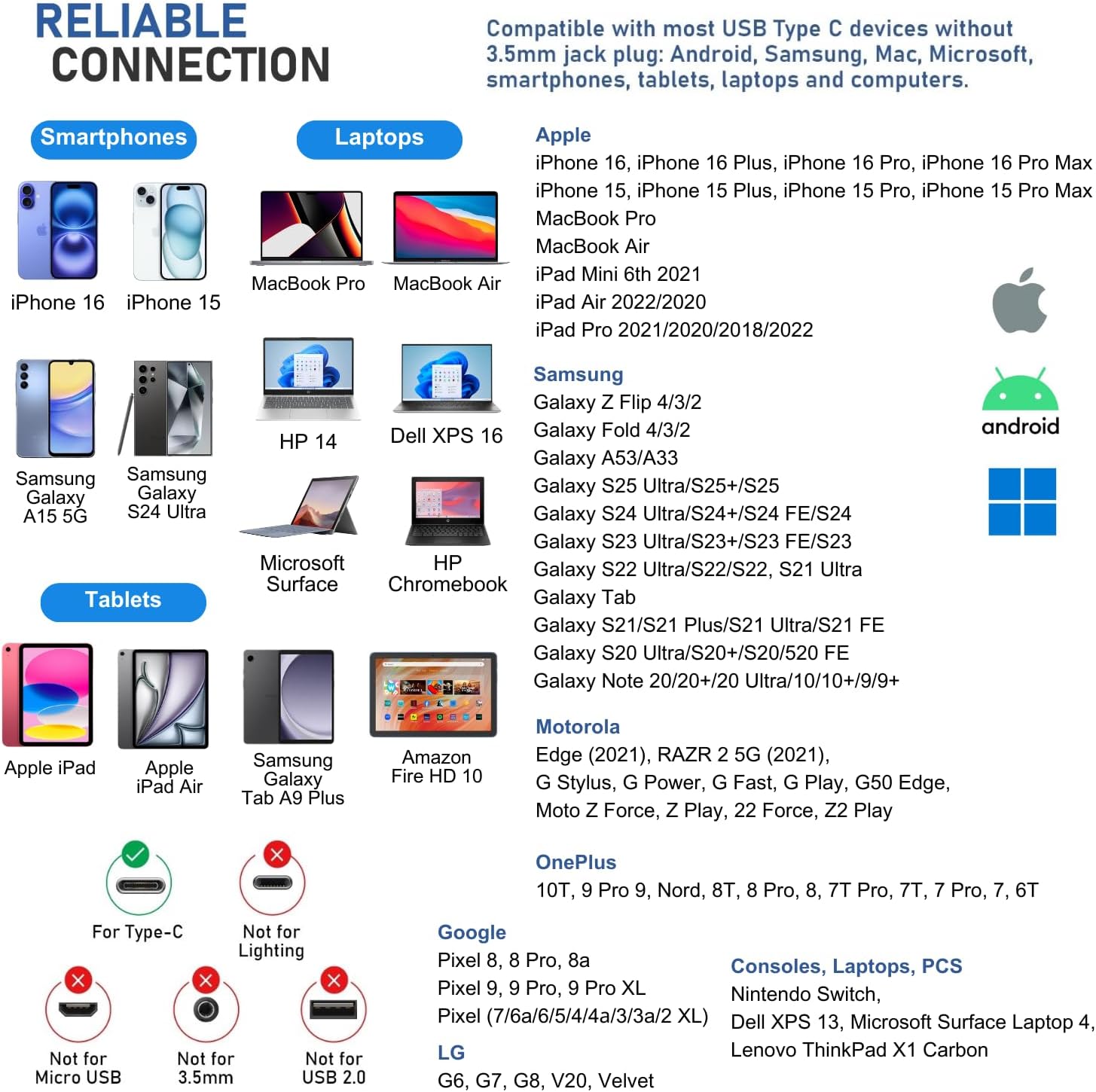 - SAMSUNG: Galaxy S24/S23/S22/S21/S21+/S21 Ultra/S21/S21 Ultra/S21 FE/S20/ Galaxy Tab S8/S7/S6/S5e, A53/A54/A33/A34 - GOOGLE Pixel 7/6a/6 PRO/6/5/4/4a — Edge 2021 — LAPTOPS: DELL XPS 13, MICROSOFT Surface Laptop 4. And more devices without a 3.5mm jack port. We provide a 5-year warranty and our customer support is here to answer questions 24/7
