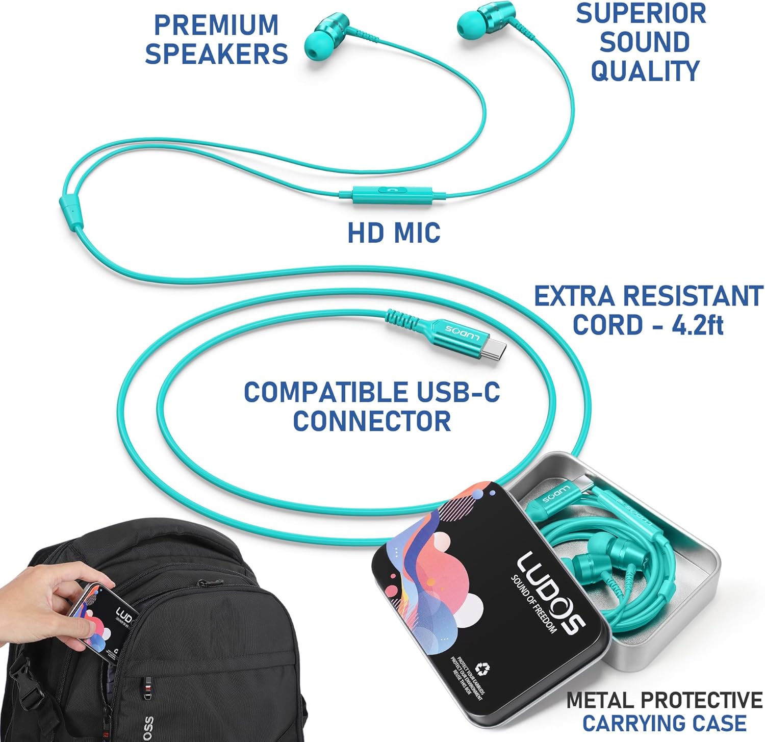 LUDOS OMNITONE USB C Headphones for iPhone 16 15 Pro Max Plus iPad Pro, 5 Years Warranty, USB-C Earbuds for Samsung Galaxy S24 S23 S22 S21 S20 A55 A54 A53, USB Type C Earphones - Turquoise