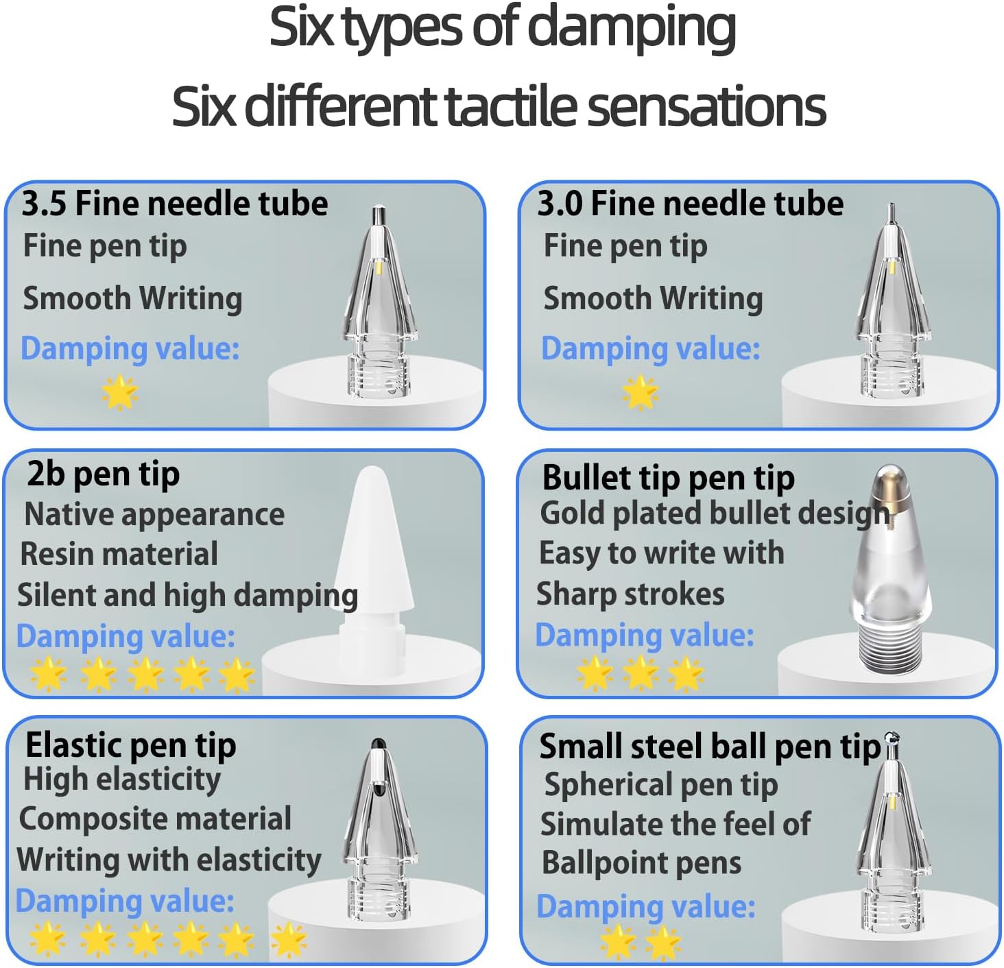 - ă6 Replacement Pencil Tipsă: With a POM material tips, replacing the original pen nib, perfect for users who are used to the original tips; with 5 different metal nibs, it allows you to have precise control when writing or drawing, so the metal nibs feel better than the original nibs. The rounded corners of the metal nib are smooth and iPad-friendly, so you don't have to worry about scratching the screen.
