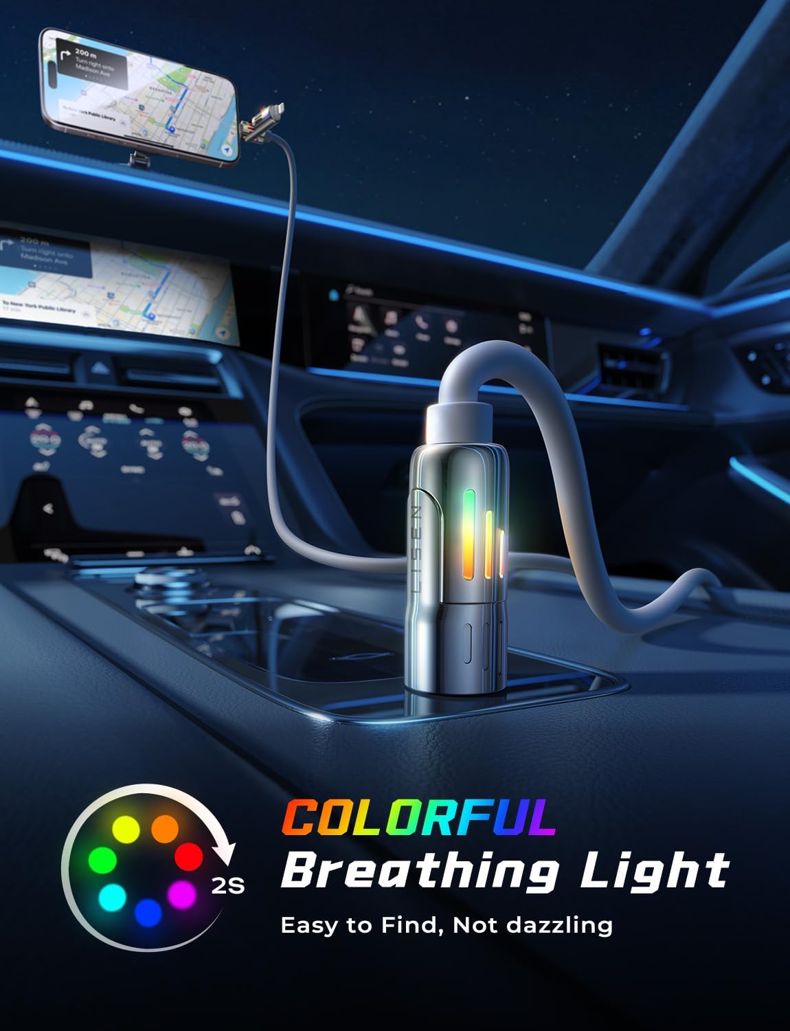 - [PD3.1 Emark Safe Chip & RGB light] The Car Carplay Cable EMARK3.1 chip not only enables 240W fast charging but also maximizes device safety, ensuring 24-hour constant temperature charging. It automatically stops charging once the device is fully charged, preventing overcharging and battery damage. And RGB lights on both ports will keep changing colours when charging. It is a soft light, not flashing eyes, full of gaming atmosphere.