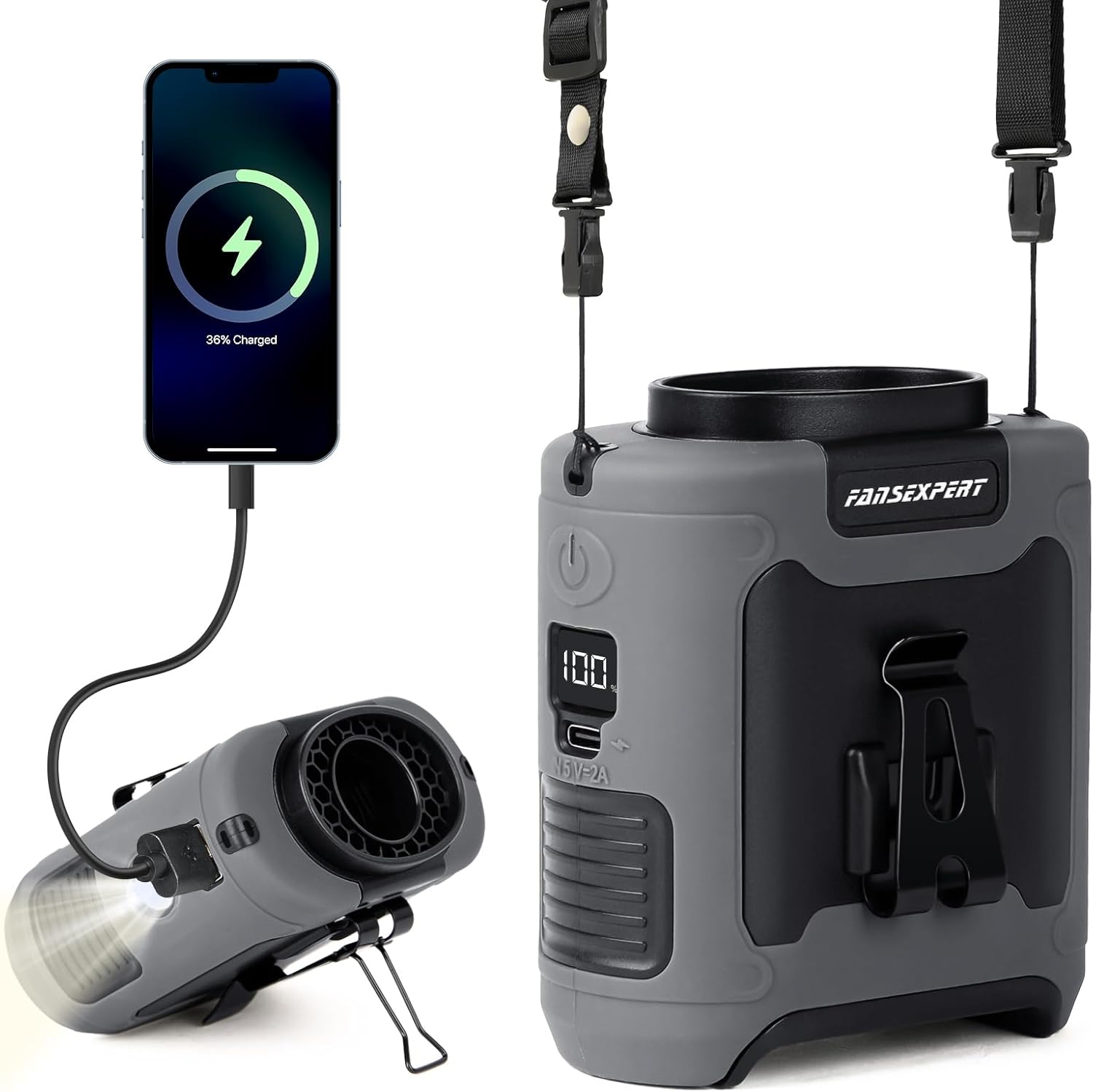 - 【5-in-1 Multi-Functional Fan】This fan serves as a waist clip on fan, desktop fan, and neck fan. You can clip it onto your shirt, belt, or pants, or hang it around your neck using the included lanyard. It also functions as an emergency power bank, charging your phone when needed. The built-in LED light and SOS feature provide illumination and safety during outdoor activities.