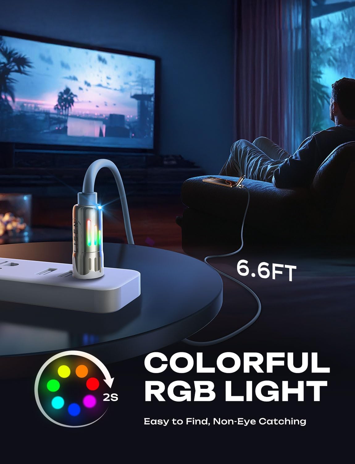 - [PD3.1 Emark Safe Chip & RGB light] The USB C to USB C Cable EMARK3.1 chip not only enables 240W fast charging but also maximizes device safety, ensuring 24-hour constant temperature charging. It automatically stops charging once the device is fully charged, preventing overcharging and battery damage. And RGB lights on both ports will keep changing colours when charging. It is a soft light, not flashing eyes, full of gaming atmosphere.