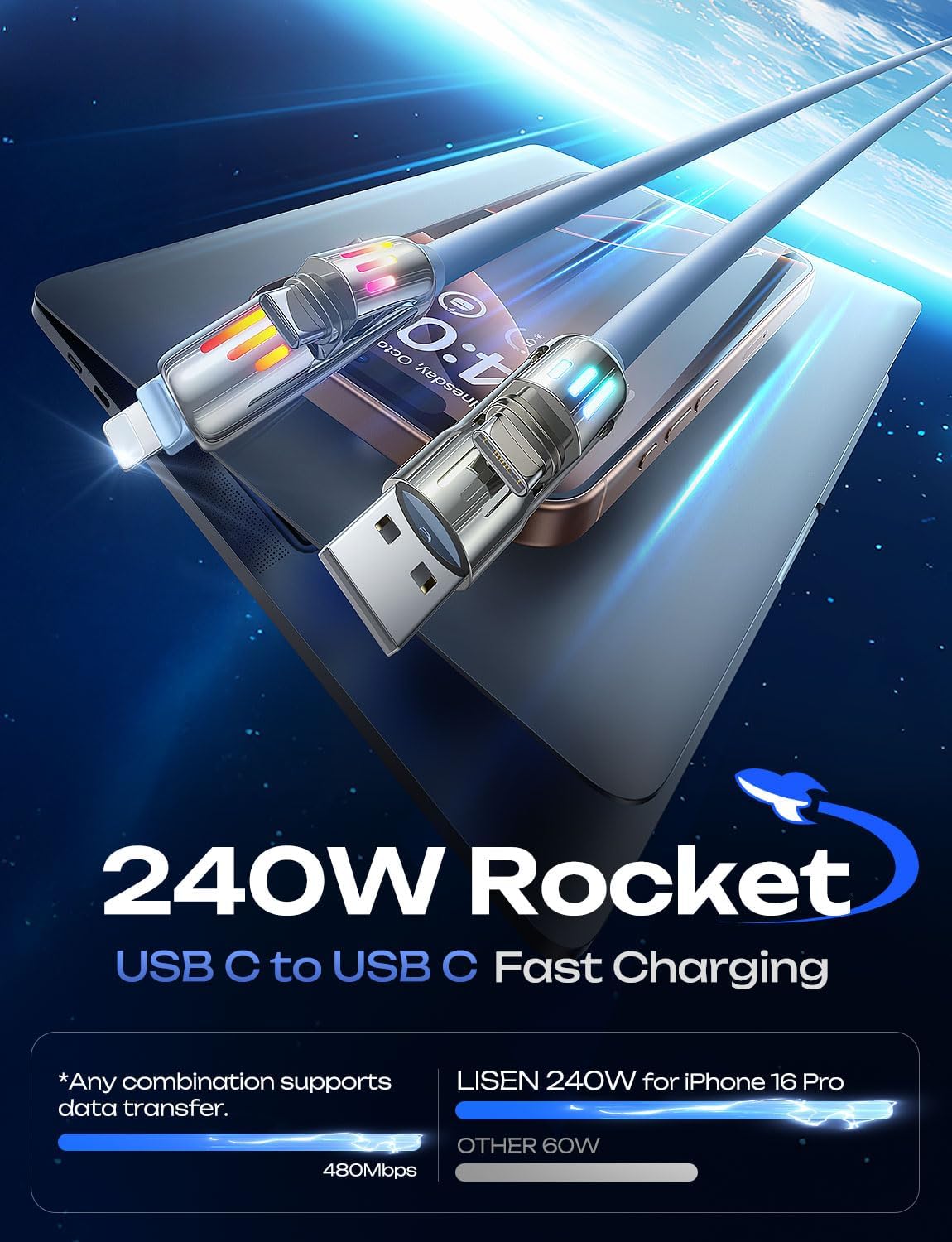 - [What You Get] LISEN iPhone Cords Fast Charging 6 FT, a length suitable for any situation, so you no longer need to stay near a power outlet. Additionally, our reliable customer service is available 24/7—if you have any questions or issues, feel free to contact us. We guarantee resolution within 24 hours. Please note, the 240W Type-C cable can power laptops through the Thunderbolt port, but it is not a USB 3.0/4K cable.