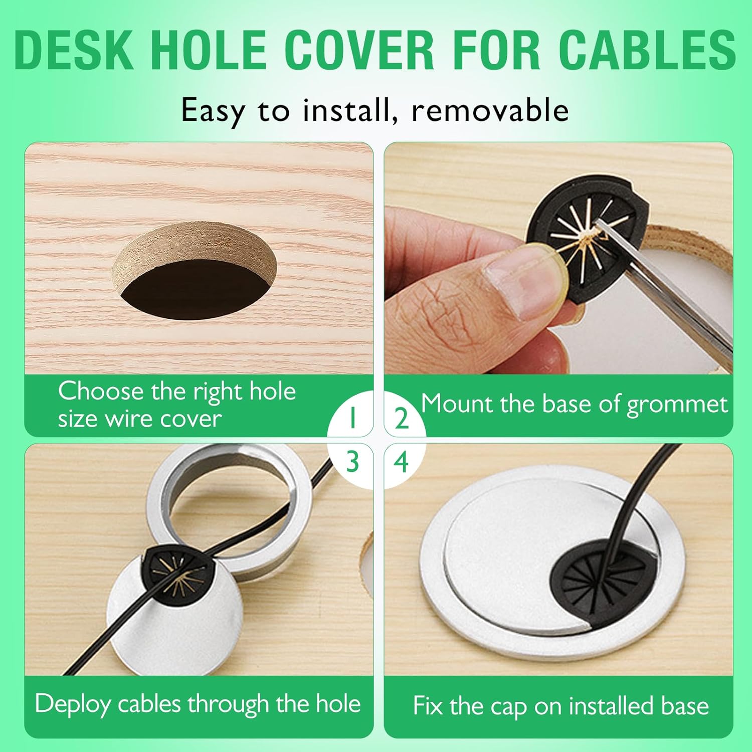 - EASY TO USE: Our desk hole grommet cover is removable, after drilling the corresponding size holes, you can first remove the lid, put the main part of the desk hole cover directly into the hole after drilling to add the wires and cables, and then close the lid; Desk cable hole outer surface is anti-slip ribs and will not loosen after installation