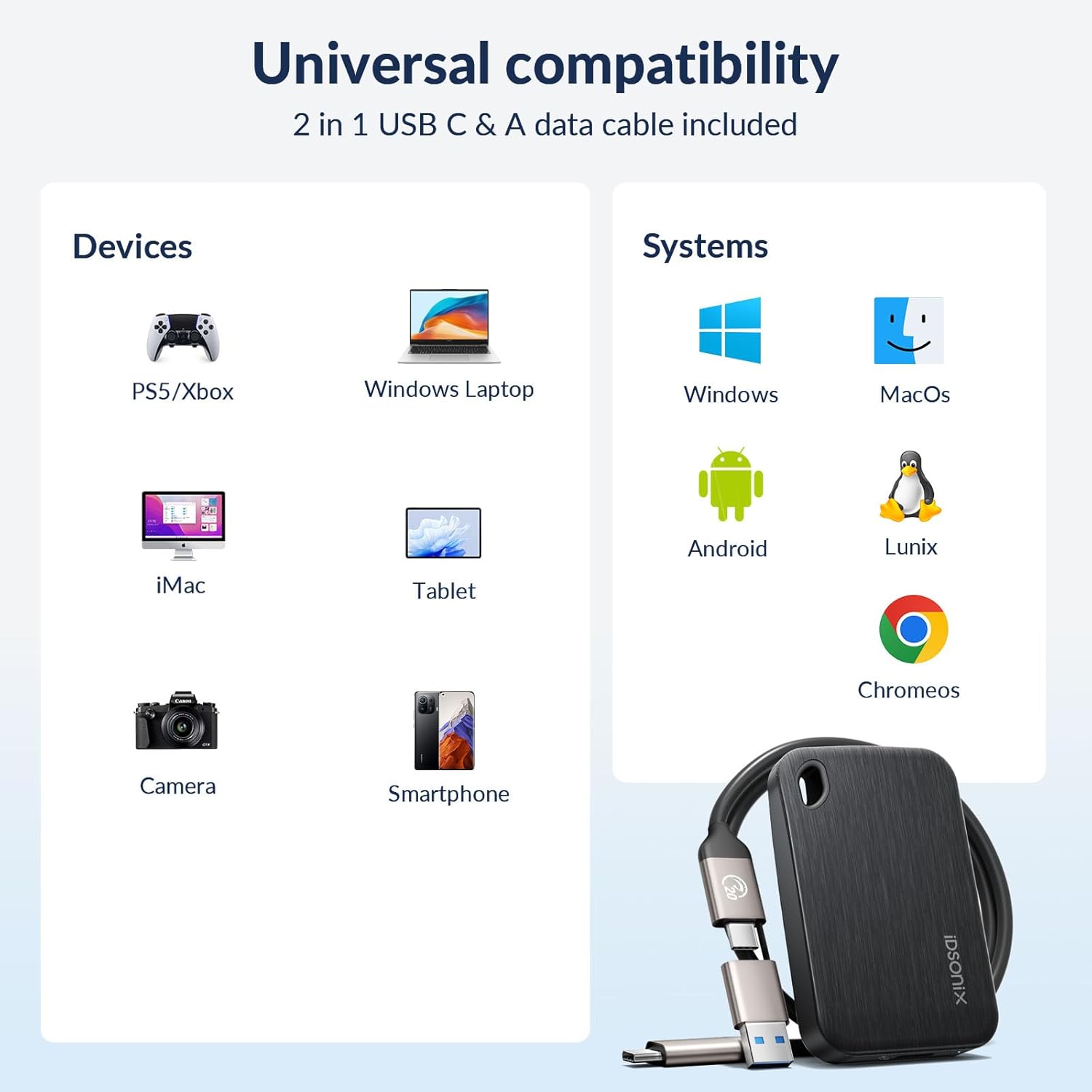 - Wide Compatibility: i20 external hard drive comes with a 2-in-1 USB C to USB A/C data cable, making it compatible with desktop, laptop, smartphone, camera, PS5, Xbox. The SSD portable supports various operating systems such as Windows, Linux, Android, iOS.
