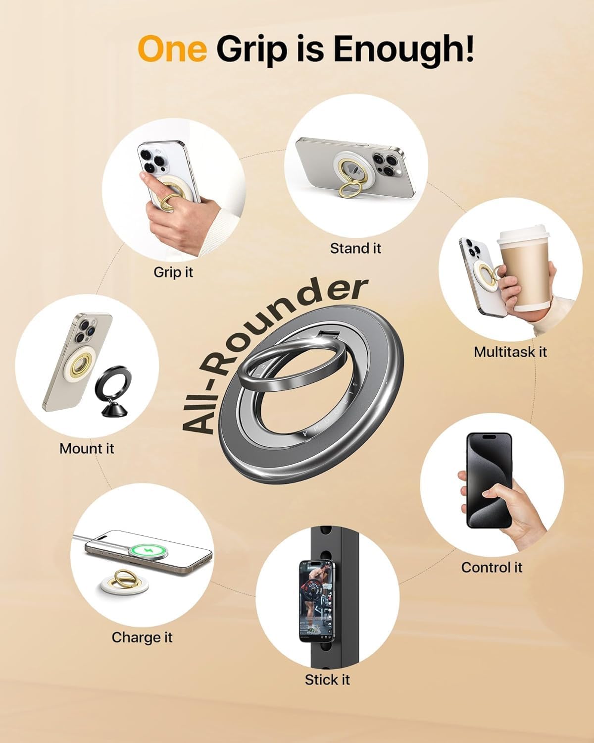 - Compatible with MagSafe: The ring grip works with MagSafe devices (iPhone 16, iPhone 16 Pro, iPhone 16 Pro Max, iPhone 16 Plus, 15, 15 Pro, 15 Pro Max, 15 Plus, 14, 14 Pro, 14 Pro Max, 13, 13 Pro, 13 Pro Max, 12, 12 Pro, 12 Pro Max) and certified MagSafe phone cases. The MagSafe phone grip is also compatible with non-magnetic phones and standard phone cases with thin metal rings (provided) on their backs