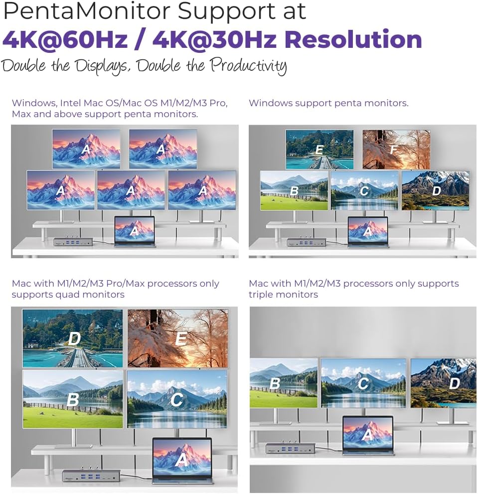 - [First Penta Monitor Dock] β Supports upto 5x 4K @ 60Hz or 1x 8K @ 60Hz. Windows: 5 displays (Mirror/Extended). Mac M1/M2/M3: 4 (Mirror), 3 (Extended). M1/M2/M3 Pro & Max: 5 (Mirror), 4 (Extended) via DisplayLink.