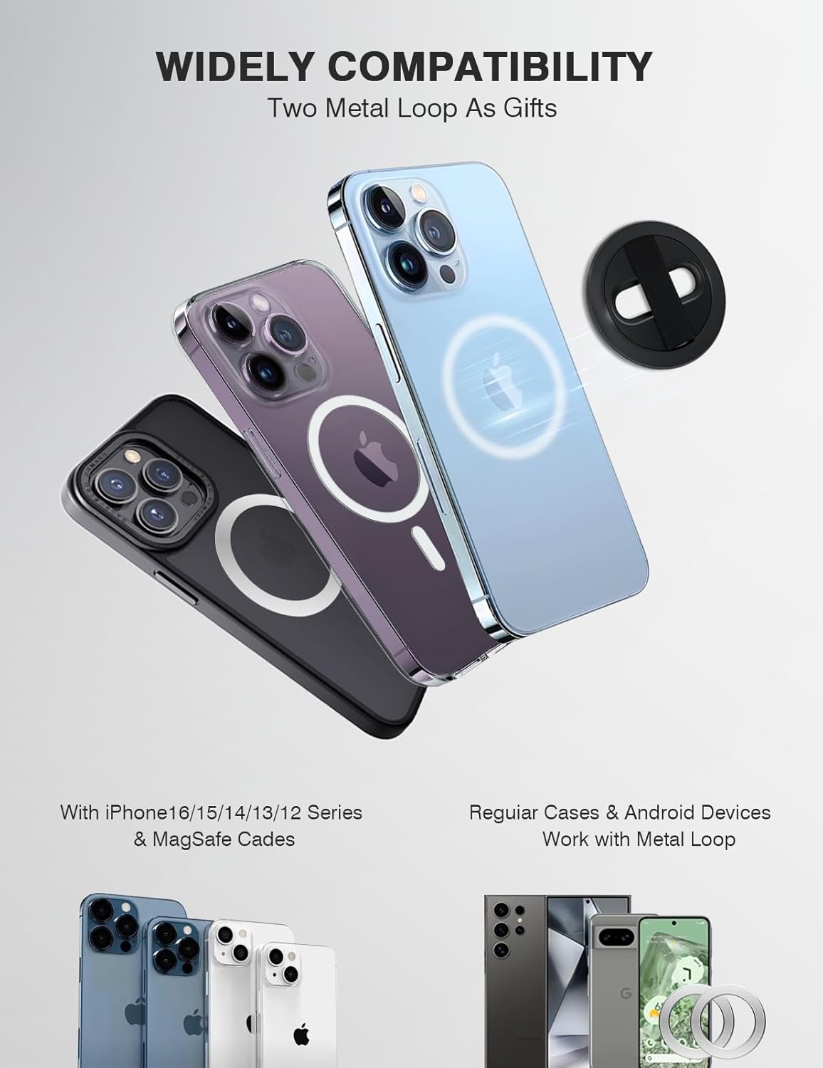 - 【Wide Compatible - iPhone & Android Devices】This magnetic stand can be attached directly to the iPhone 12/12 Pro/12 Pro Max, 13/13 Pro/13 Pro Max, 14/14 Pro/14 Pro Max, 15/15 Pro/15 Pro Max, 16/16 Pro/16 Pro Max, or the MagSafe magnetic cases. We are pleased to offer two metal loops as a gift, making the Gornergrat stand compatible with all smartphones, including the iPhone 11/11Pro/X/XS/XS Max/8/7, Samsung Galaxy/Note/Flip series, Google Pixel series, and more Android devices.