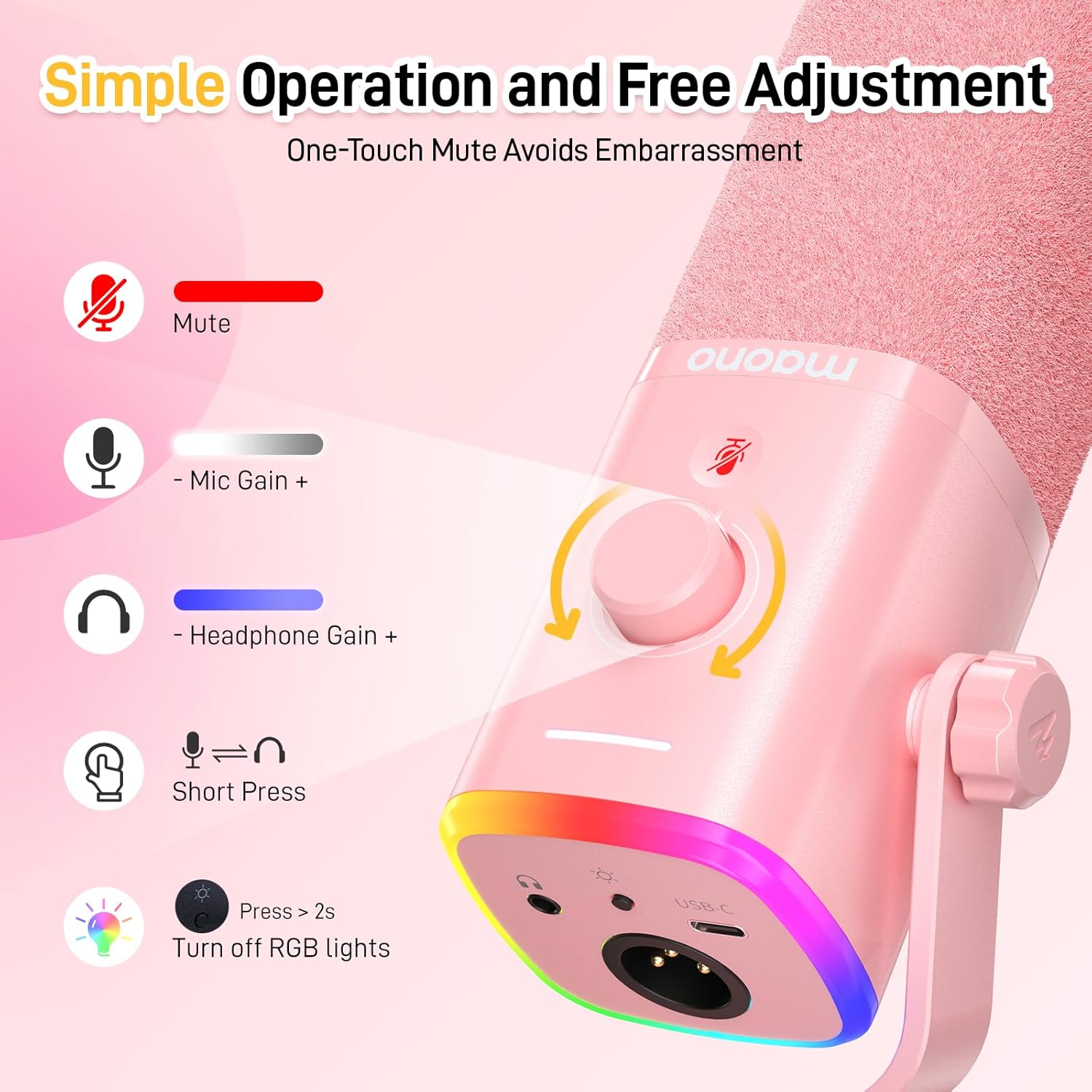 - Special Feature : Maono Link Software, Mute Function, Headphones Jack, Monitoring Volume Control, Buitin 3/8" and 5/8” Threads, RGB Lights, Noise Reduction, Volume Control, XLR/USB Connection Maono Link Software, Mute Function, Headphones Jack, Monitoring Volume Control, Buitin 3/8" and 5/8” Threads, RG… See more