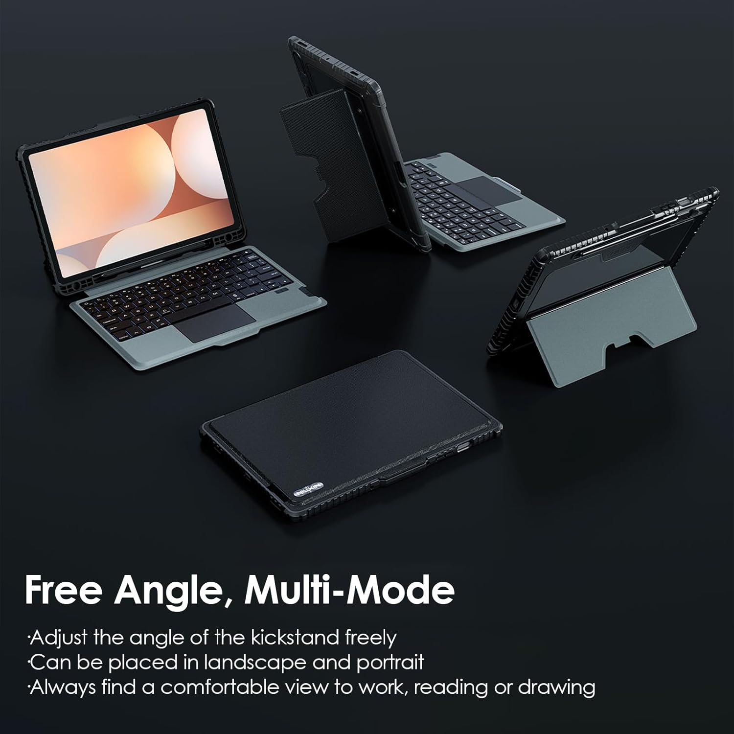 - Free Angle, Multi-Mode - The kickstand offers adjustments from 0° to 180°, allowing it to be placed in landscape or portrait mode. Stable and durable, you can find the perfect angle for taking notes, watching videos, writing, working, browsing, or drawing. The keyboard can be easily detached to enjoy drawing or playing games.