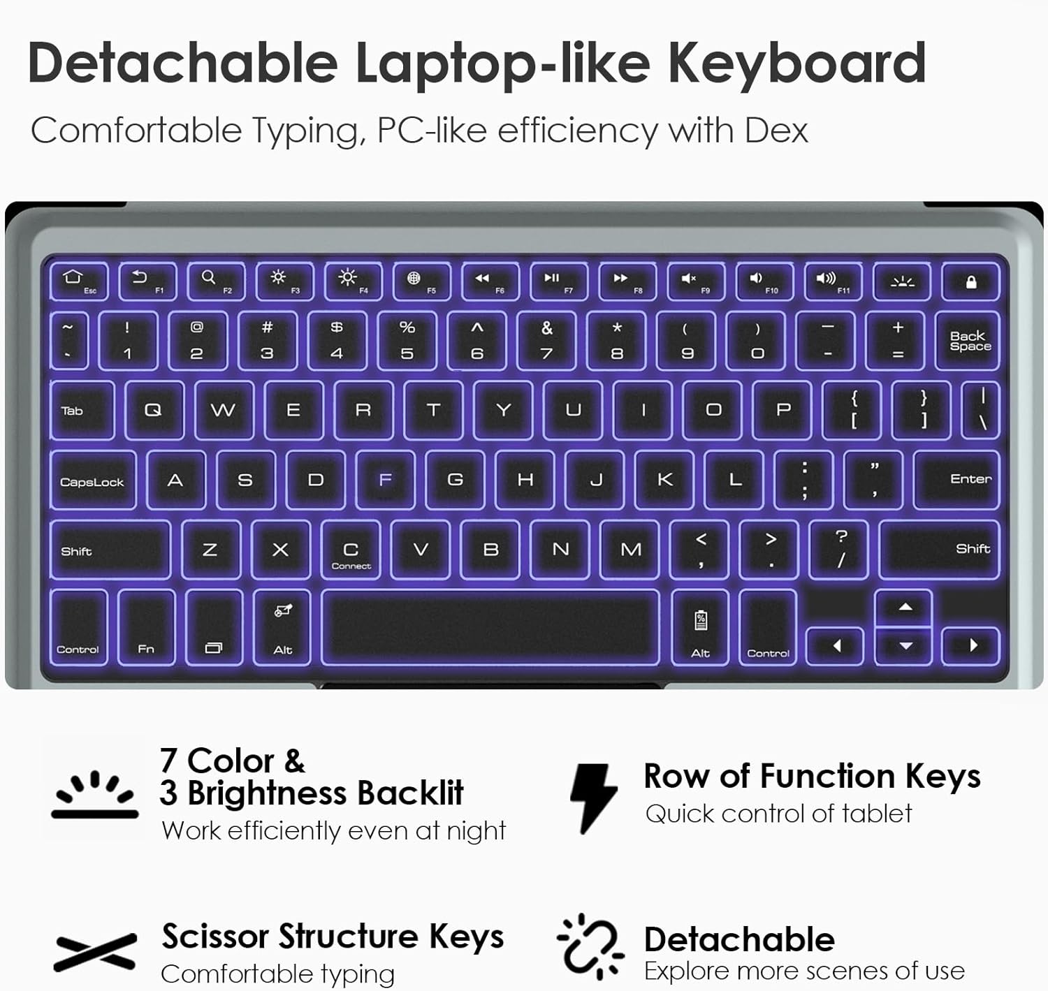 - Efficient Backlit Keyboard - Clear key feedback that offers a laptop-like responsive and comfortable typing experience. A full row of function keys, supports Galaxy Tab shortcuts, allowing for quick editing of documents and presentations, thus maximizing your efficiency, especially in Dex mode. The keyboard features 7 colors and 3 levels of backlit brightness, making it possible to work or learn even in dark environments.