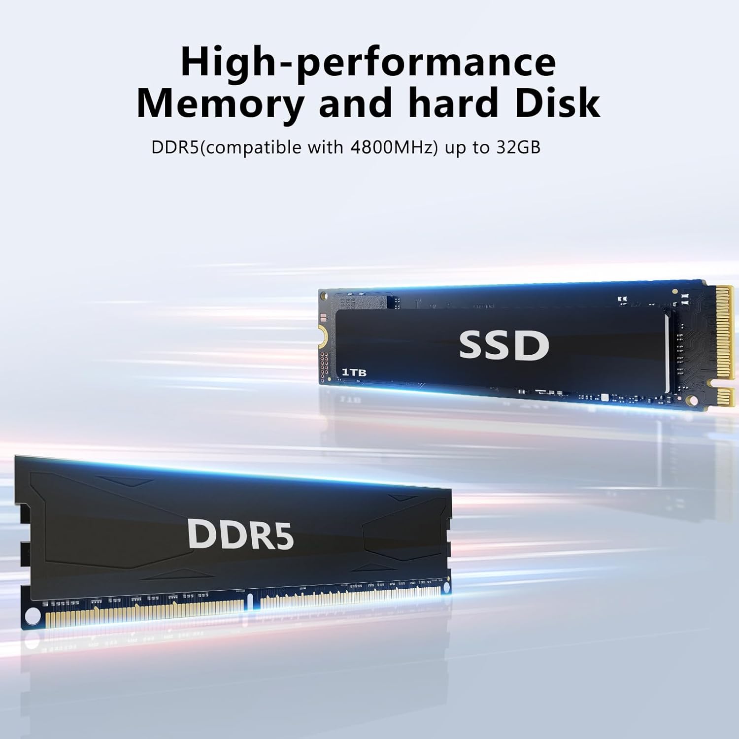 - RAM and SSD:1xDDR5 SODIMM ram slot supports 4800MHz. Supports 3-memory: 2xM.2 2280 NVMe/PCIe3.0x1 2280 SSD+1x2.5 inch SATA3.0 SSD/HDD.