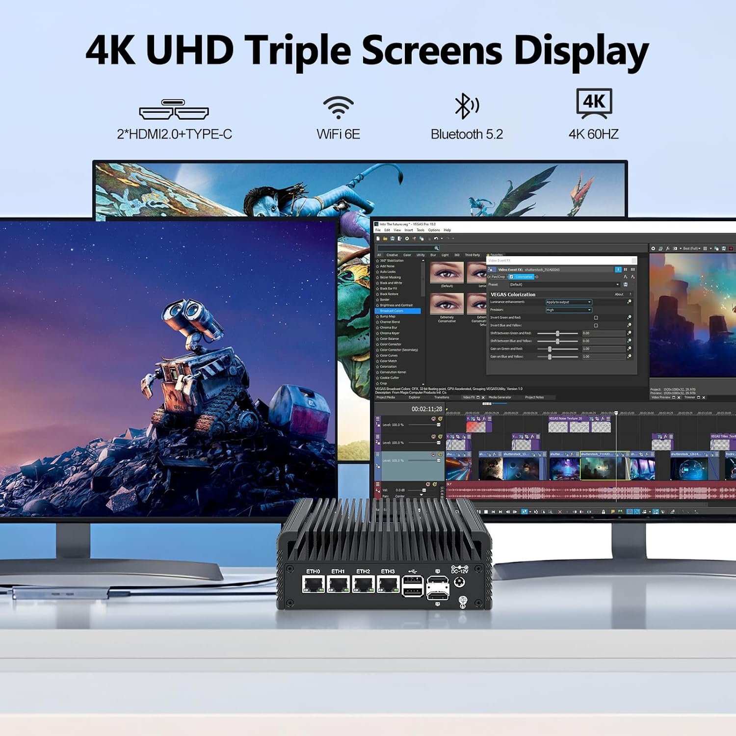 - Rich Ports:Mini pc firewall with 4* i226-V 2.5G RJ45 LANs, 2*USB3.2 port, 4 x USB2.0, 2xHDMI2.1, 1xDP1.4, 1xType-C Support 4x4K display(support 3-screens display at same time).