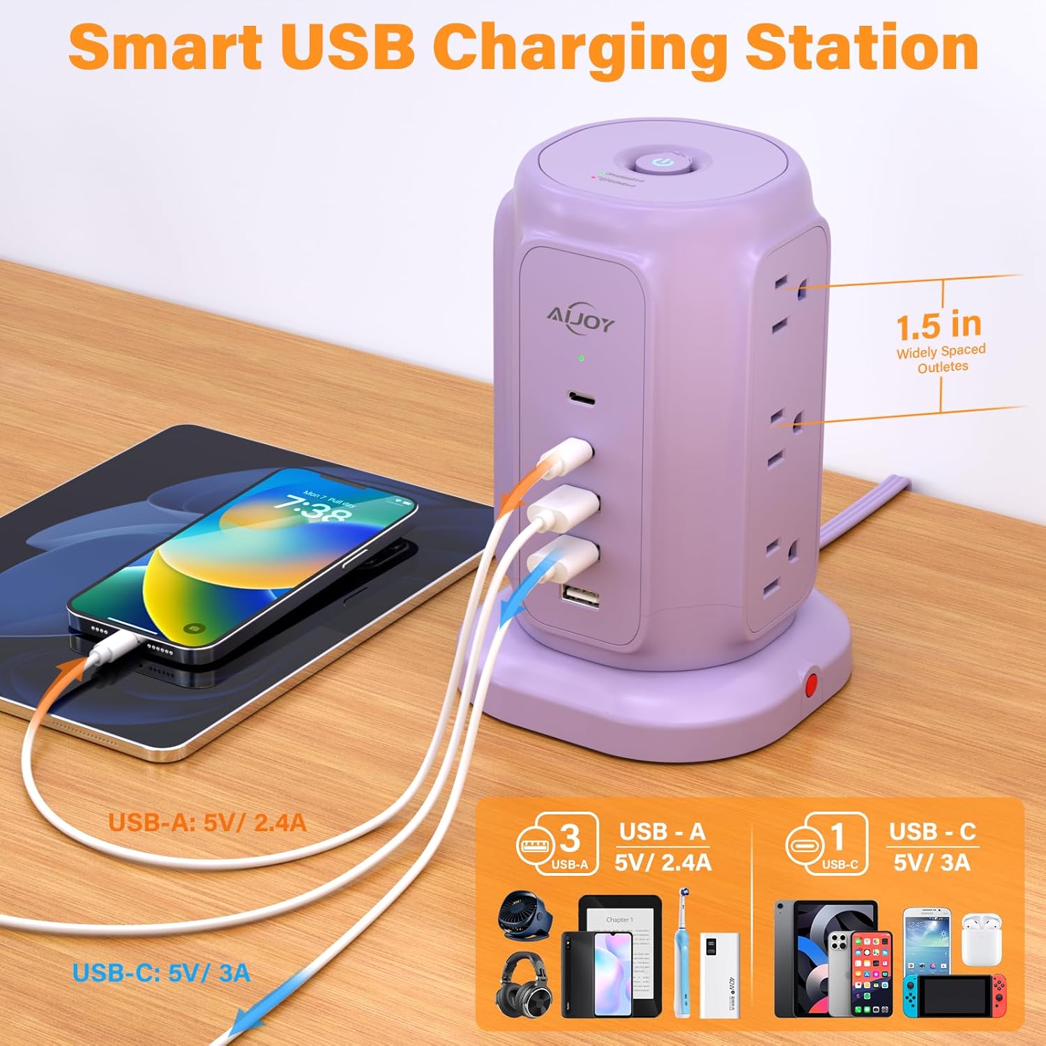 AiJoy Flat Plug Power Strip Tower with 9 Outlets and 5 USB Ports (2 USB C), 1200J Surge Protection with 1625W Extension Cord with Multiple Outlets for Dorm Home Office Supplies, Purple