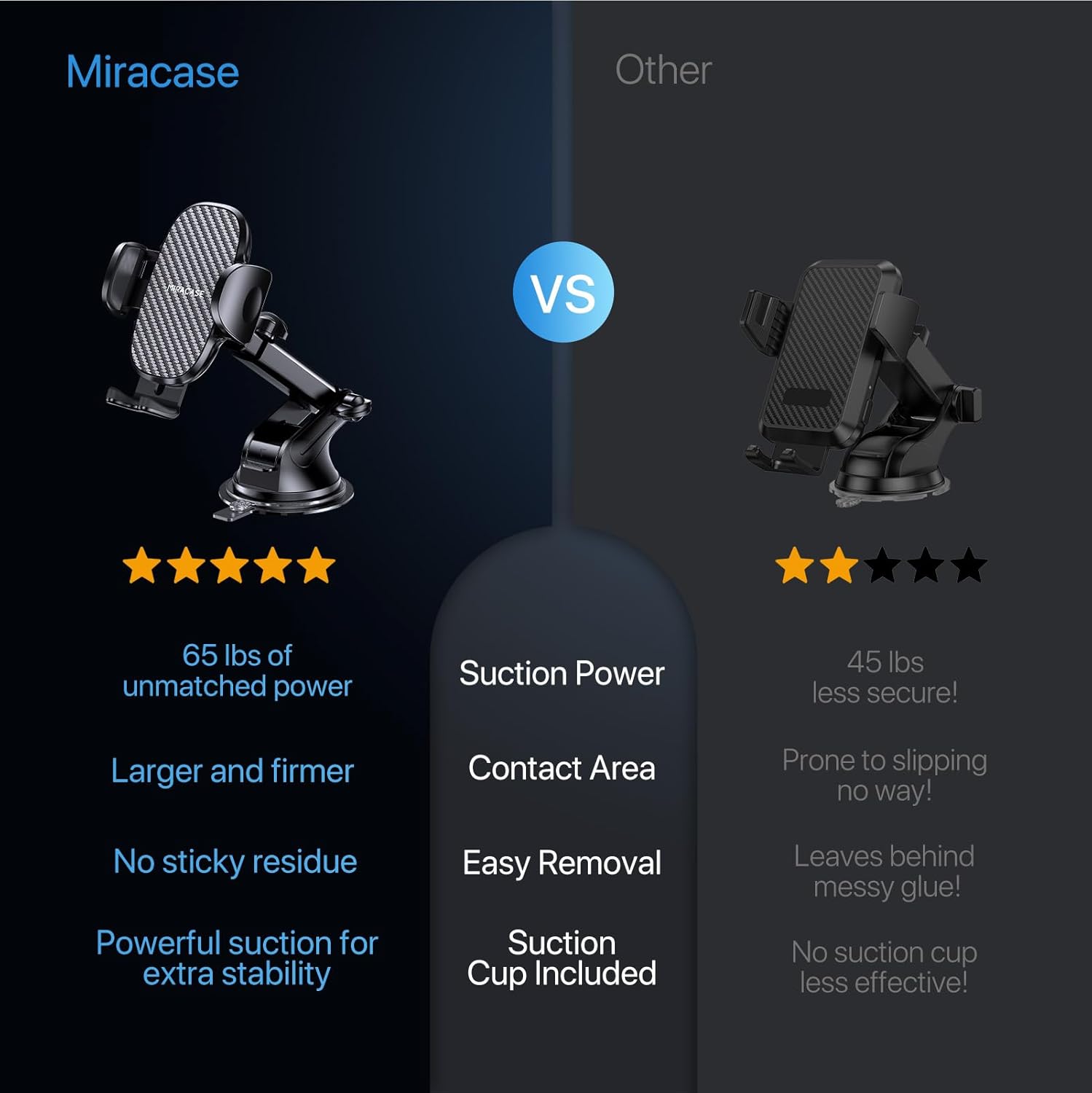 - STRONG SUCTION POWER: The cell phone car mount uses a powerful 3-layer viscous gel and a 1-step locking mechanism to provide strong suction on a smooth surface without leaving any residue. They will not fall off even when turning, bumping or driving at high speeds, and using TPU material can withstand temperatures from -4°F to 203°F. To restore the stickiness, simply rinse with warm water and let it air dry. NOTE: Most likely will not work on leather/ vinyl dashboards.