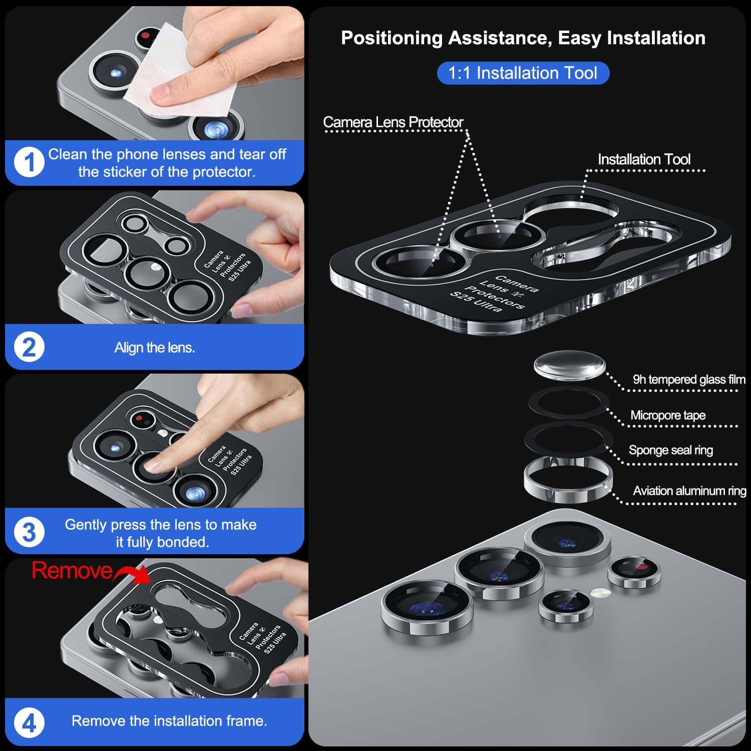 - 1:1 Original Design for: WSKEN samsung galaxy s25 ultra camera lens protector use 99.99% optical-grade light transmittance with aluminum alloy metal 9H tempered glass, protective enough while providing clear photos like the original camera.