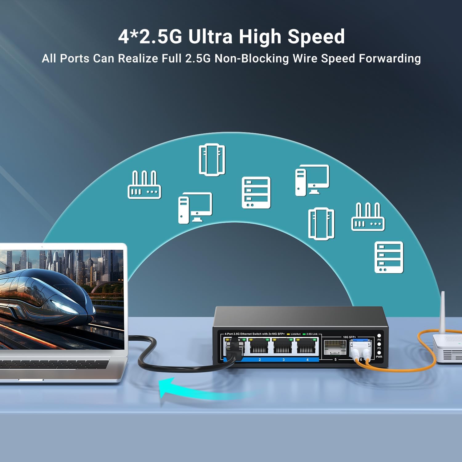 - 🌐Plug and Play: Unmanaged Plug and Play with automatic MDI/MDIX and non-blocking data forwarding support, and 10/100/1000M/2.5G adaptive support on ports 1-4 for speeds up to 2.5 times faster than existing 1G networks. Easily set up without any configuration or software to provide optimal performance for all your devices.