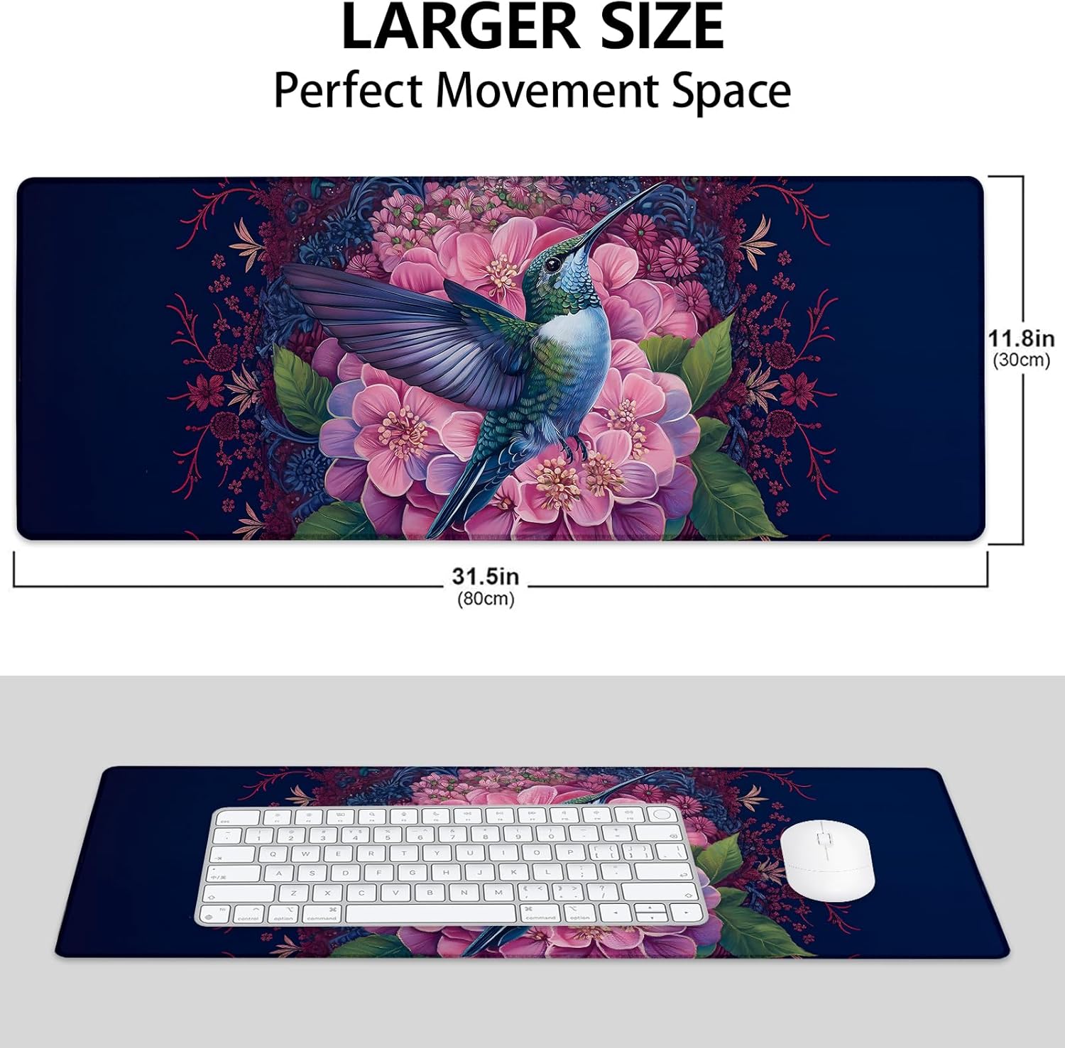 Floral and Hummingbird Large Mouse Pad, Gaming Mouse Pad, Keyboard Mat, Non-Slip Rubber Base, Office Accessories, Desk Mat, MousePads for School, Work, Home Decor Gifts 31.5" x 11.8"
