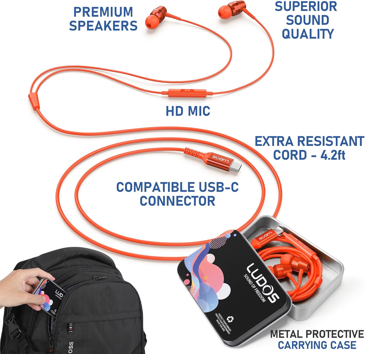 LUDOS OMNITONE USB C Headphones for iPhone 16 15 Pro Max Plus iPad Pro, 5 Years Warranty, USB-C Earbuds for Galaxy S24 S23 Ultra S22 S21 S20 A55 A54 A53, USB Type C Earphones - Coral