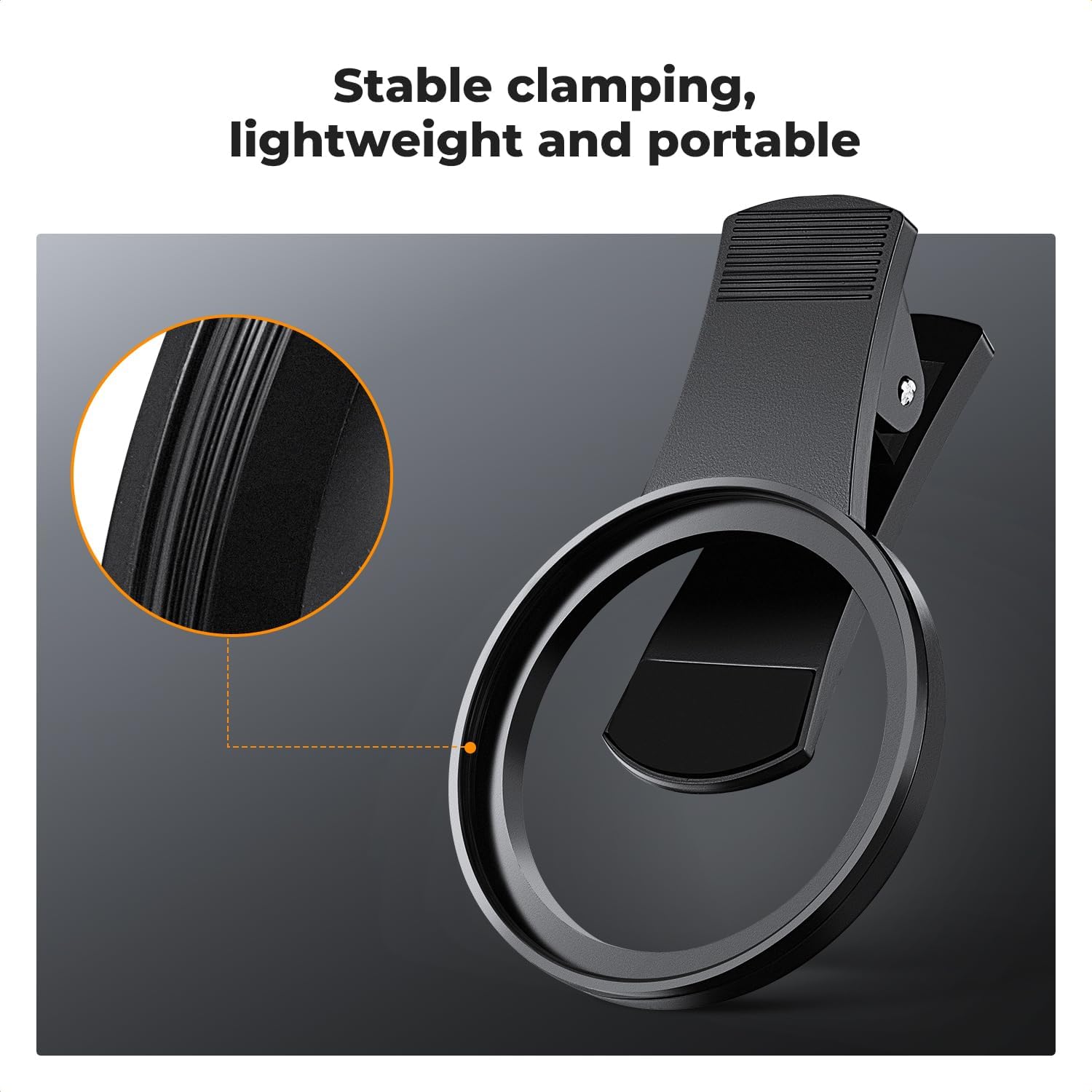- Quick Install & Easy Operation: Simply screw the variable ND filter on the phone clip, then clamp it on your phone, rotate the filter to a desired stop according to the light condition and start taking photos. During a photo shoot, easily rotate the filter to adjust light exposure for different effects