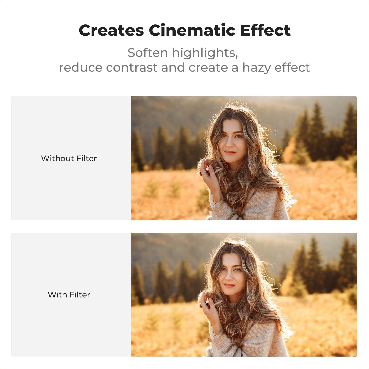 - Soft Highlight Flares, Lowered Contrast: The K&F Concept 1/8 black diffusion filter makes the picture or video light soft and controls highlight flares, making skin or pores more delicate, double side polishing technology ensures the image's true color.