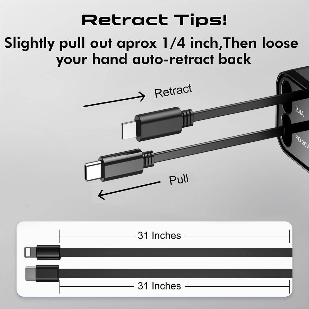 - SPACE-SAVING DESIGN WITH POWERFUL PERFORMANCE:This 4-In-1 Retractable Car Charger Combines A Compact Size With Powerful Charging Capability. Designed To Fit Snugly Into Your Car'S Interior, It Rotates 160° And Is Compatible With 12v Cigarette Lighters (0.8-Inch Width, 2.8-Inch Depth). Its Retractable Cable Extends Up To 31 Inches, Keeping Your Car Organized. A Perfect Blend Of Space-Saving Design And Functionality, This Charger Is An Ideal Gift For Truck Drivers, Commuters, Or Anyone Who Needs Quick And Efficient Charging On The Go