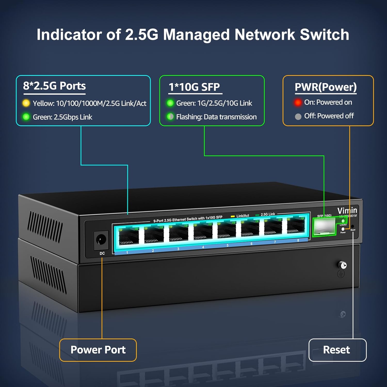 - 8x2.5G RJ45 Port & 1x 10G SFP Port: The vimin 2.5G managed switch features 8 adaptive 2.5G RJ45 ports and 1x 10G SFP+ port, providing a flexible range of connection options for growing enterprises.