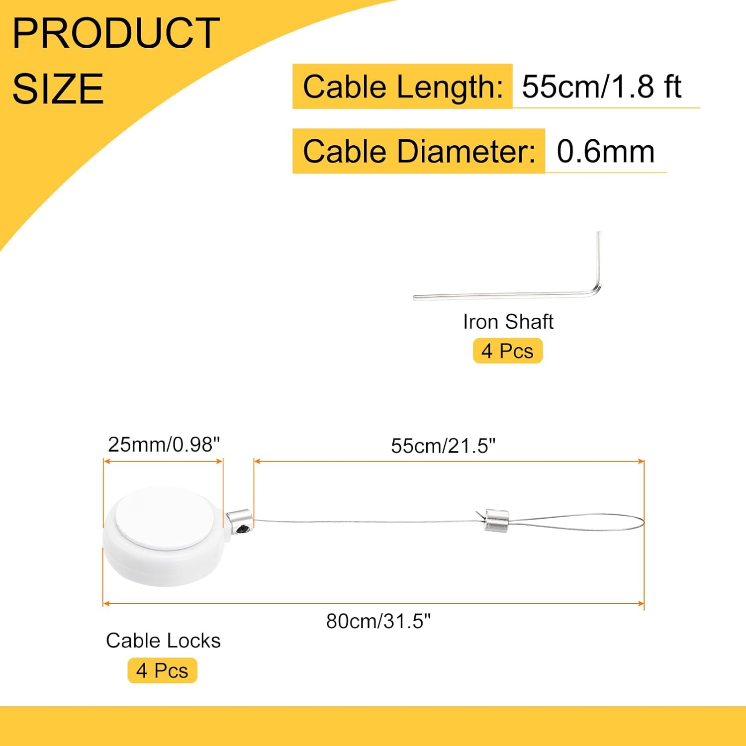 - Security Lock with Latch, is in size of: 58cm x 25mm/2.28 x 1 Inch; Cable Length: 55cm/1.8 ft; Cable Diameter: 0.6mm; Tension: 200g; Color: White; Material: ABS, Steel Wire; In the Package of: 4 x Cable Locks, 4 x Wrench