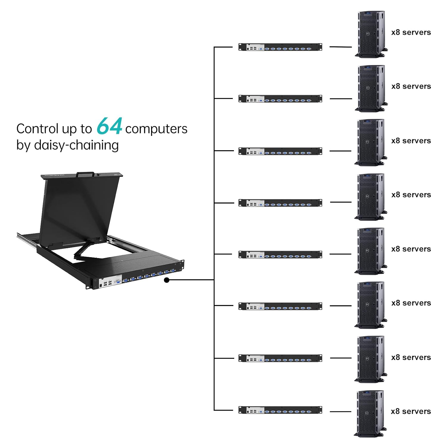 - Rack kvm vga with 19'' monitor Support daisy chain up to 64 computers/servers with our this 8 port rack mount kvm (ASIN:B09NPXNC6X or B0BJ6M71RP).