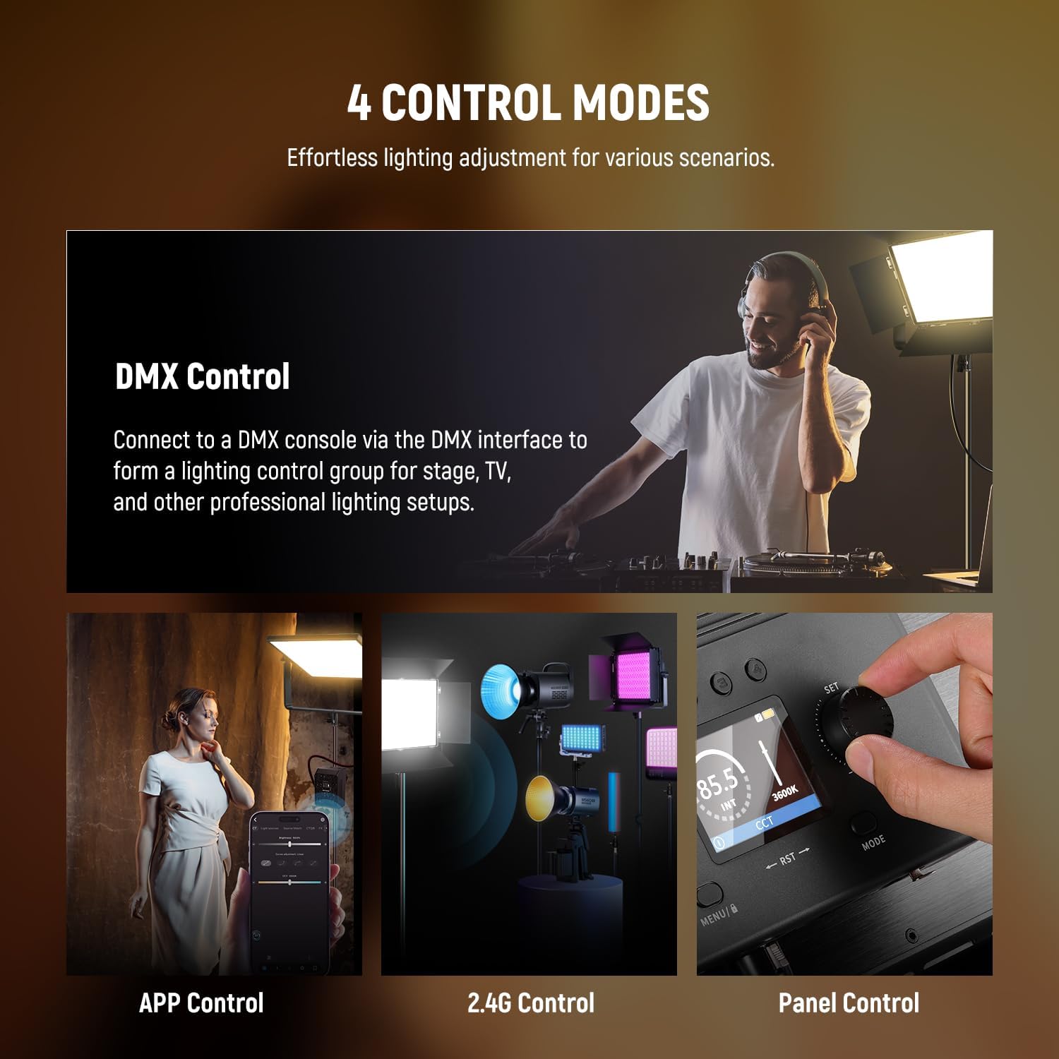 - 【APP/2.4G/Panel/DMX Control】 4 control methods to meet both the pro and novice. Easily achieve wireless control and multi light group management via the NEEWER APP; realize master and slave light control (AP150C, PL60C, FS300C, FS150C, RGB2, RGB1200, MS60C, MC60B, MS150B, FS150B, BH30S, CB60B, etc.) with the built in 2.4G module; and make parameter adjustments easily with the panel with a TFT color display. A 5 pin DMX port can connect to a DMX console for complex multi light setups