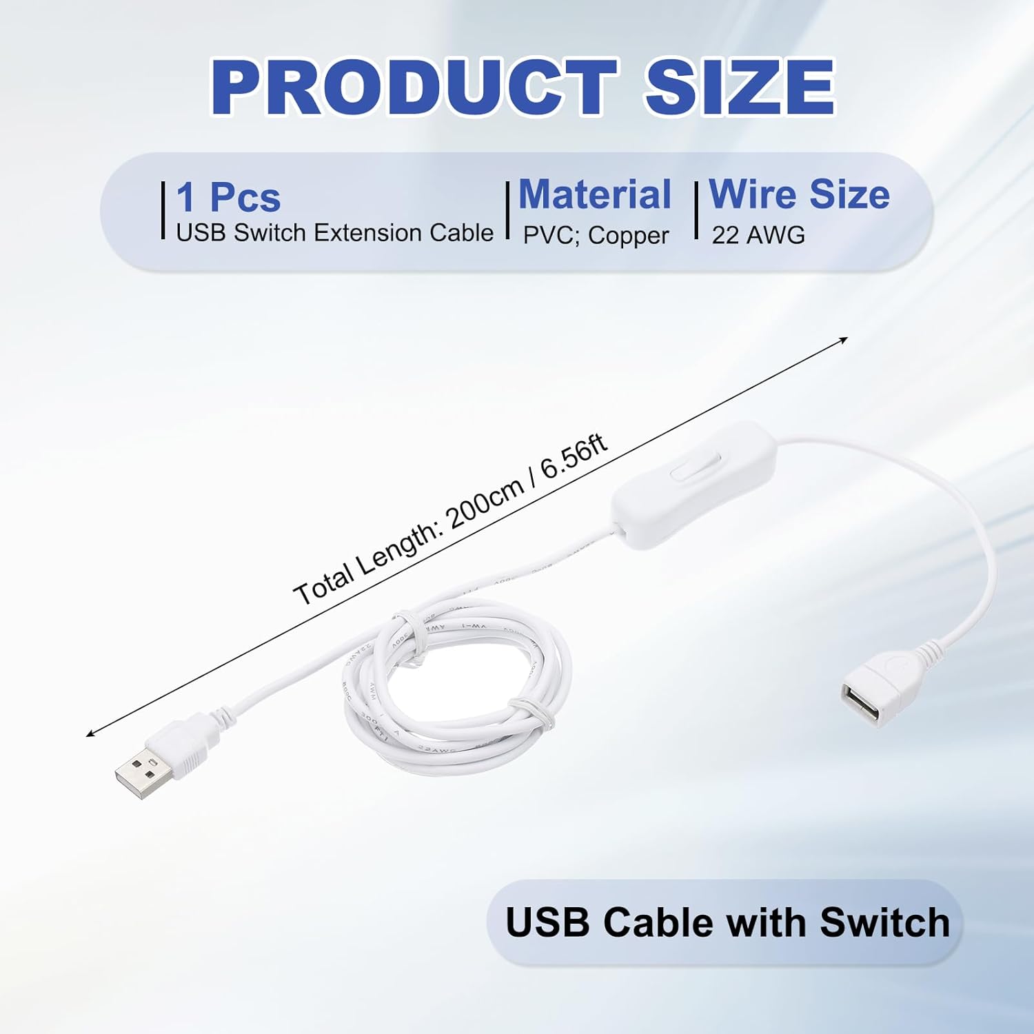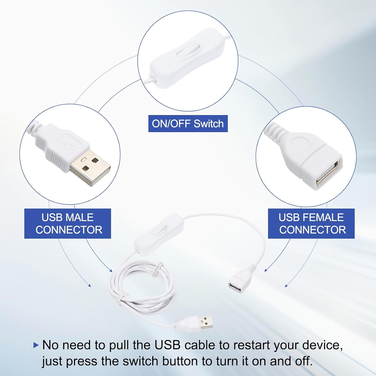 - Good for a variety of settings, including home offices, bedrooms, and entertainment areas. Whether you need to power LED strips for ambient lighting, desk lamps for focused work, or USB fans for cooling, this USB Switch Extension Cable with On/Off Switch is the perfect accessory. Enhance your space with the convenience and flexibility this cable provides.