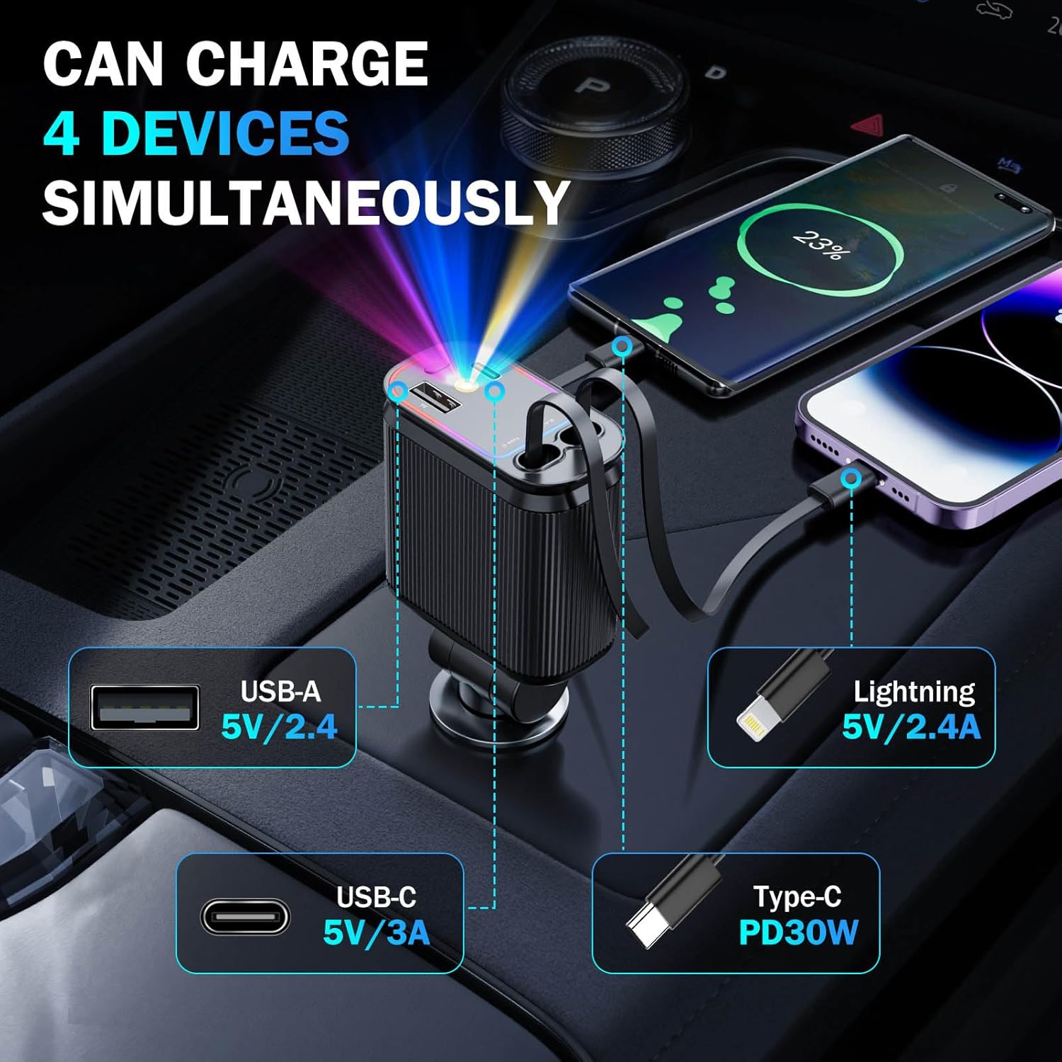 - [ Upgraded Car Charger ]:Car Charger with Starry Sky. The 4 in 1 car charger equippes with a real PD 66W Type-C retractable cable (fast charging port), and IOS retractable cable, and additional USB-C and USB-A ports, this charger offers fast charging for up to four devices simultaneously.
