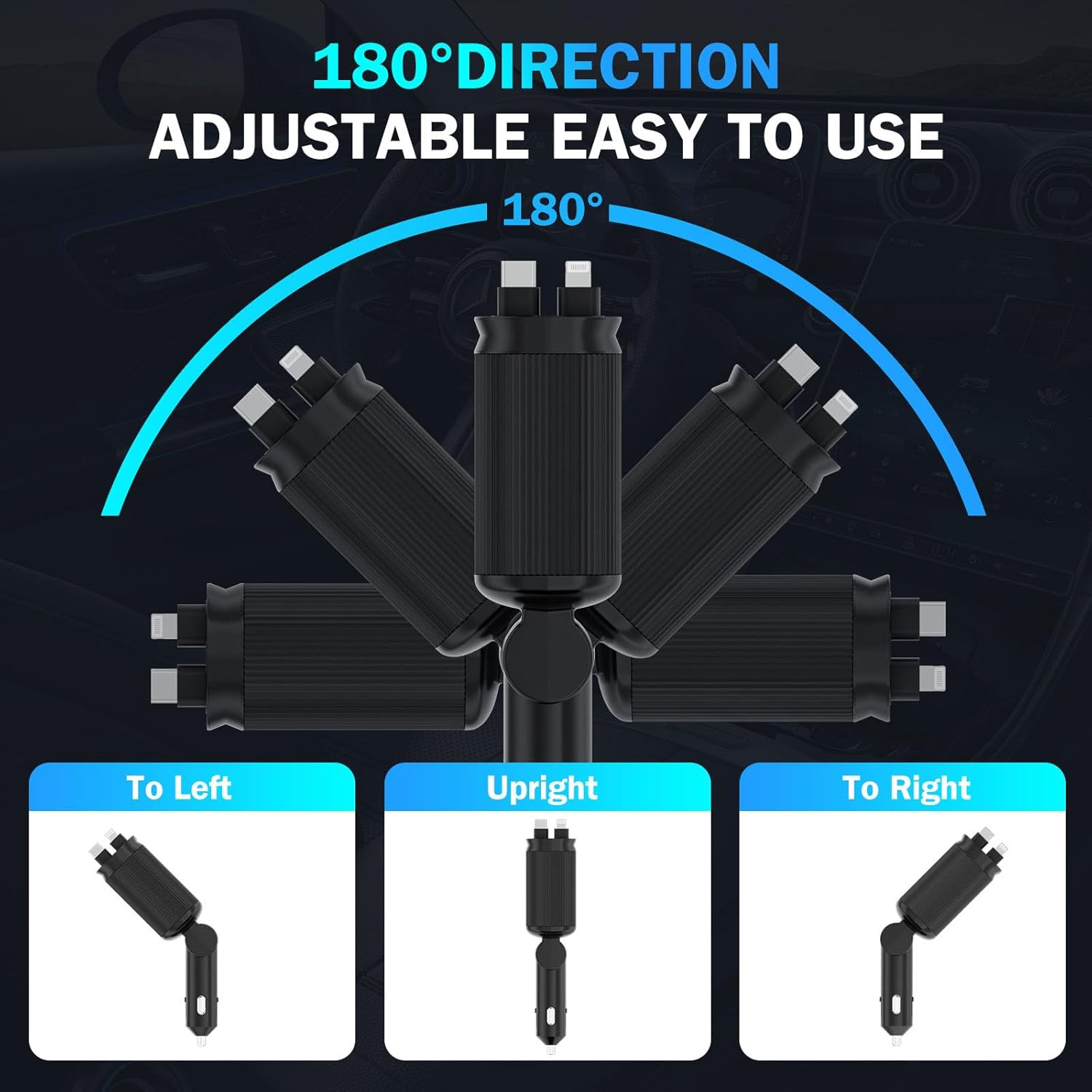 - [ Adjustable 180-Degree Charging Plug ]: The retractable charging plug can be adjusted left and right by 180 degrees, providing secure and stable charging even on bumpy roads, making it a reliable car charger USB C option for long journeys.