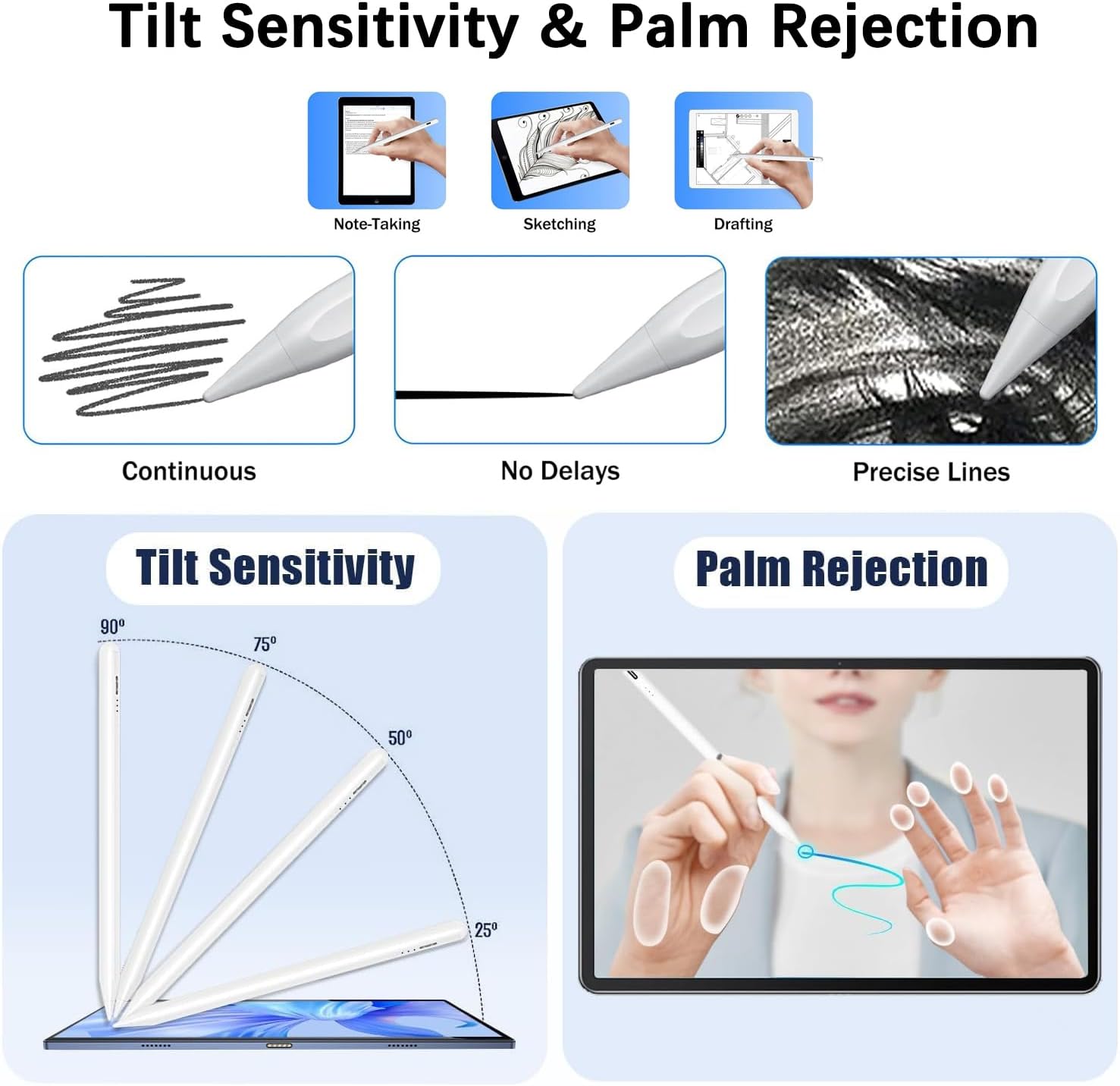 - 🖊【Palm Rejection & Tilt Function】No need to wear anti-friction gloves as you can rest your hand on the screen without worrying about accidental touches. The upgraded built-in magnet in the pencil for iPad offers stronger attraction than the original Pencil and firmly attaches to the side of iPad. This enables easy portability and prevents the stylus from slipping or getting lost.