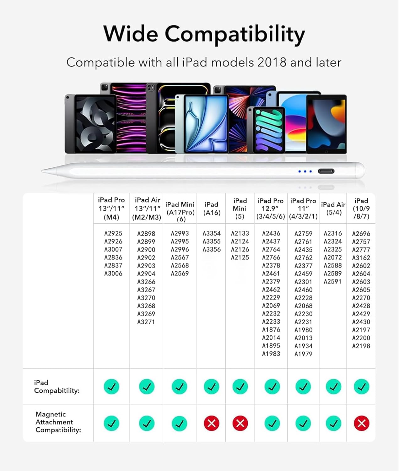 - 🖊【Only for iPad 6-11 Gen & iPad Pro 2018-2025】Note: Please check the correct model before you order or contact us to confirm.Stylus Pen for iPad 11th A16&10th Generation ONLY compatible with iPad & iPad Pro(2018 -2025): iPad A16/10th/9th/8th/7th/6th, iPad Pro 13" (M4), iPad Pro 12.9"(3rd/4th/5th/6th), iPad Pro 11"(All Generations), iPad Air M3/M2/5th/4th/3rd Gen, iPad Mini A17 Pro/6th/5th Gen.Operate : Settings > General > About > Model name