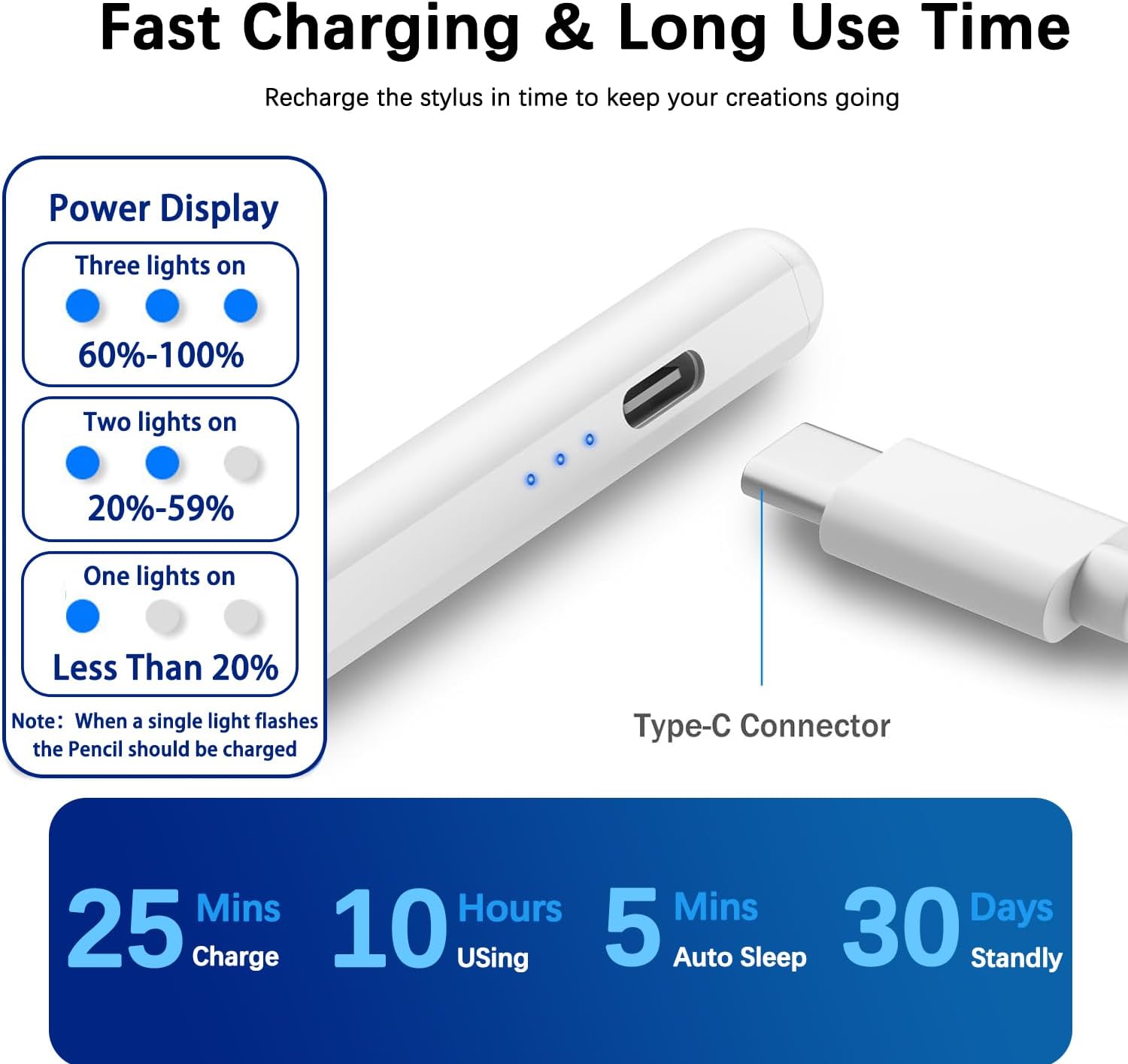 - 🖊【Power Display & Type-C Fast Charge】3 levels of LED indicators can remind you to charge stylus in time.Power display:three lights on:60%-100% power,two lights on:20%-59% power,one light on:under 20% power.Stylus Pen with the USB-C charging port and fully in 25mins and allows 10 hours of continuous use,auto"sleep mode"after 5 mins of inactivity help conserve battery power