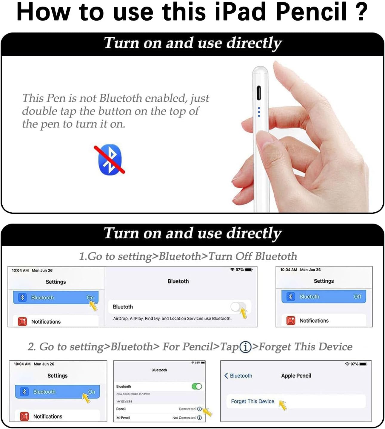 - 🖊【Easy to Use】PLEASE NOTE: The stylus pen doesn't have Bluetooth. Double-click the top of the ipad stylus to turn on/off easily without connecting Bluetooth. If you find pen for ipad doesn't work after turning on, please turn off Bluetooth: Settings > Bluetooth > Turn off Bluetooth, or follow the steps to disconnect the Bluetooth connection between your iPad and Pencil: Settings > Bluetooth > Pencil > tap "i" > Forget this device.