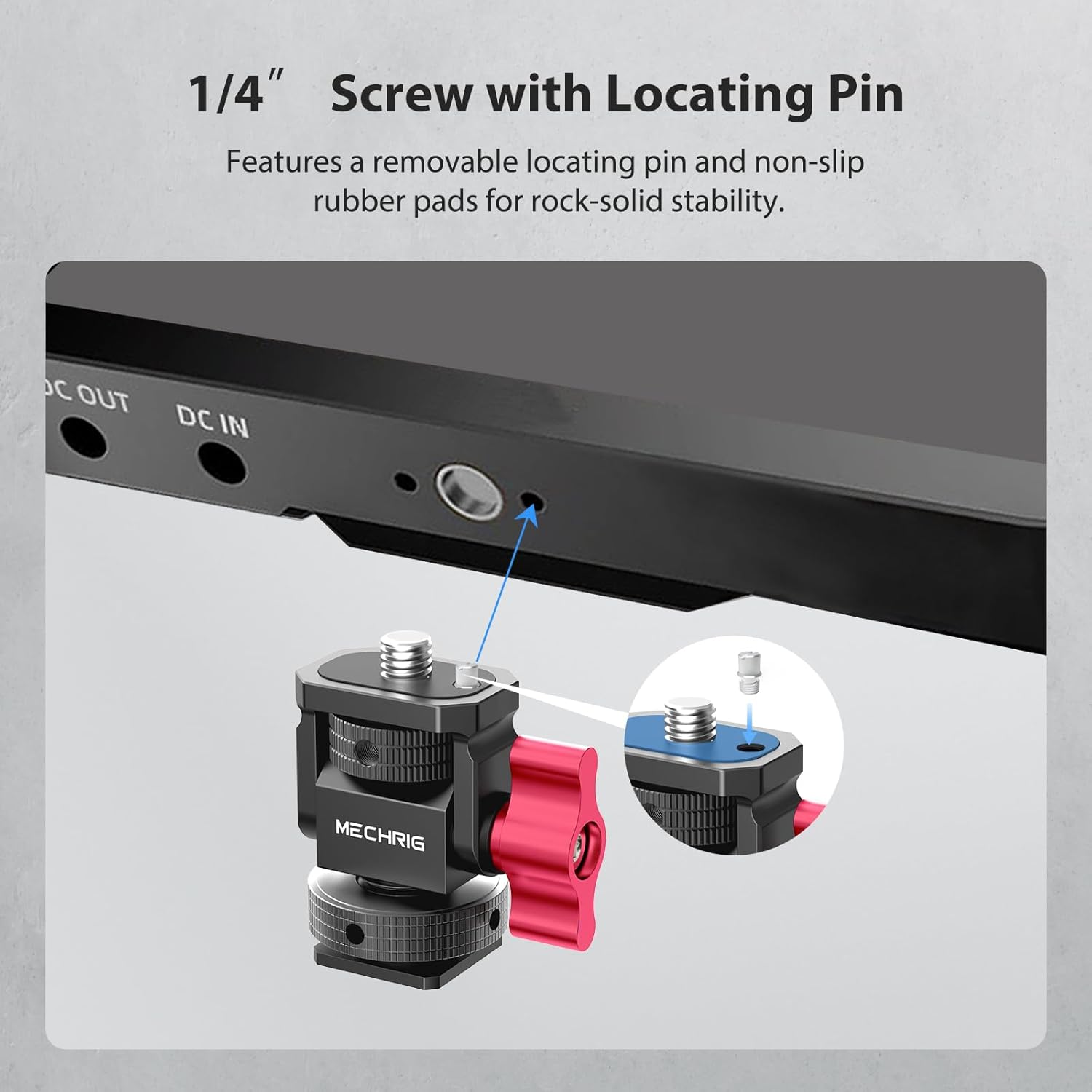 - Anti-Twist Pin and Non-Slip Rubber Pad: The field monitor mount includes a retractable anti-twist pin to prevent rotation and a non-slip rubber pad to protect your equipment from scratches. These features provide added stability and security, even during dynamic shoots