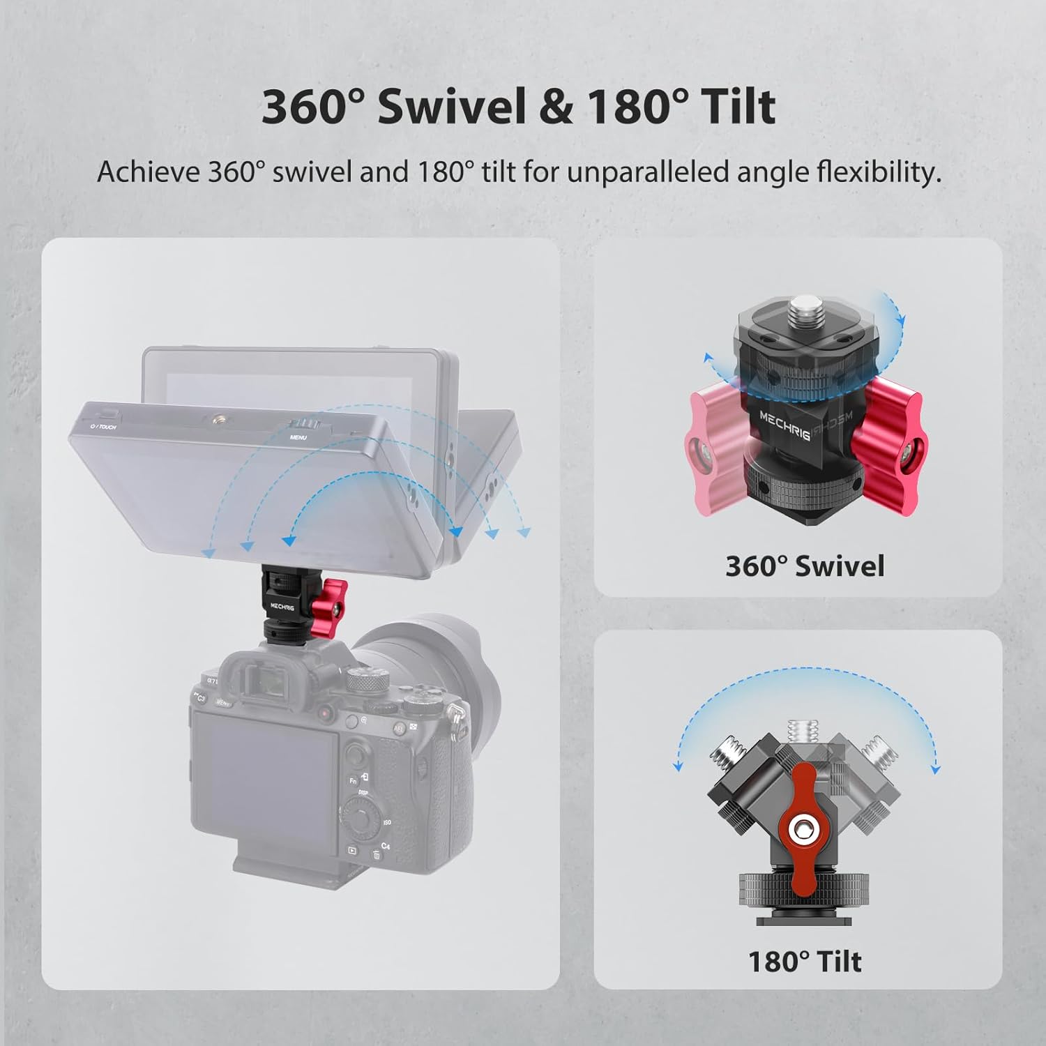 - Smooth Damping with 360° Swivel & 180° Tilt: Experience smooth and precise positioning with the camera monitor mount’s 360° swivel and 180° tilt capabilities. The adjustable damping allows for tool-free angle adjustments by side knob, ensuring your monitor or accessory is always in the perfect position