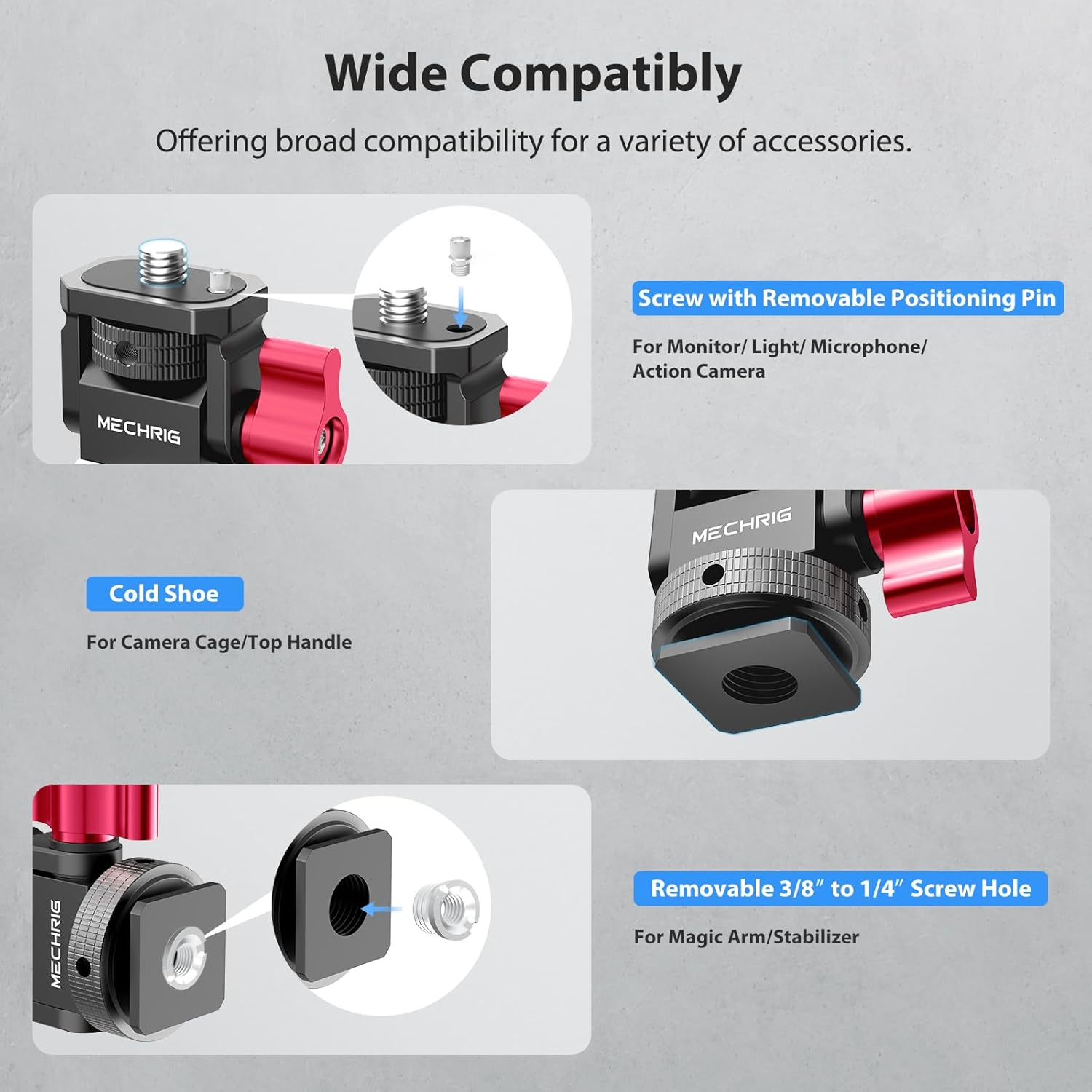 - Universal 1/4"-20 Thread for Multiple Accessories: The cold shoe mount is equipped with a 1/4"-20 screw at the top, supporting a wide range of accessories such as monitors, microphones, and LED lights. This versatile design ensures seamless integration with your existing gear