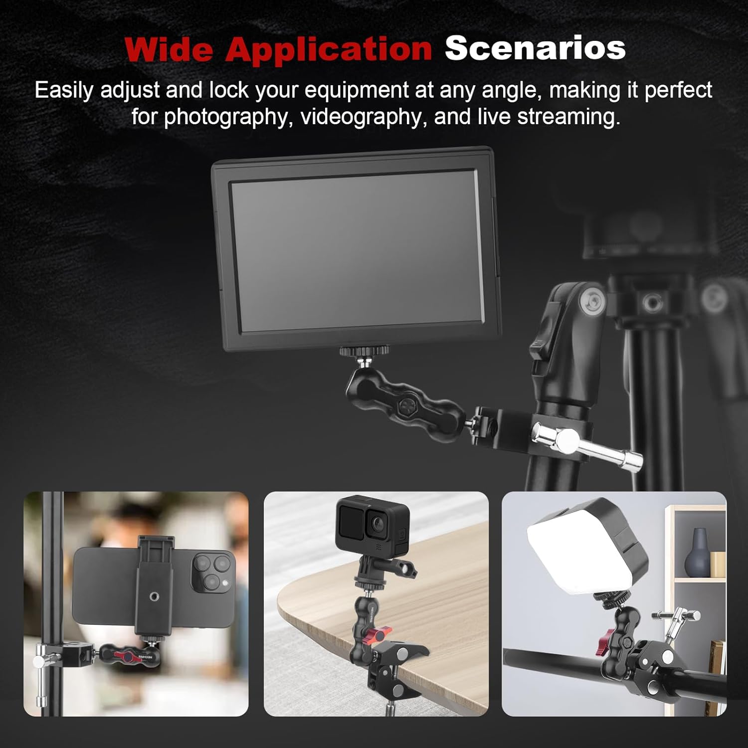 - Universal 1/4" Screw Compatibility: The dual ballhead magic arm features a 1/4" screw, allows you to easily attach and secure your devices, providing a reliable solution for photography, videography, and live streaming setups. Whether you're capturing footage on a DSLR, recording action-packed moments with a sports camera, or setting up a professional studio with multiple accessories, this magic arm offers the flexibility and stability needed for high-quality content creation