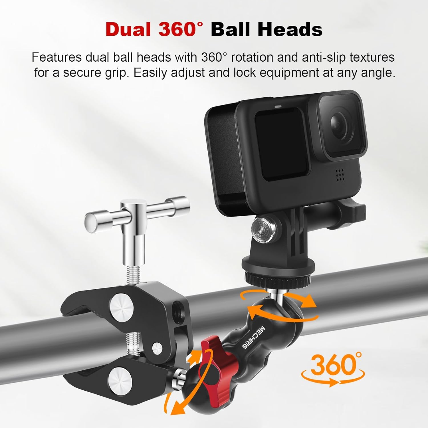 - Dual 360° Ball Heads for Precision Angling: The camera clamp mount features dual ball heads with 360° rotation and anti-slip textures for a secure grip, allowing precise angle adjustments and stable positioning of equipment, perfect for photography, videography, and live streaming